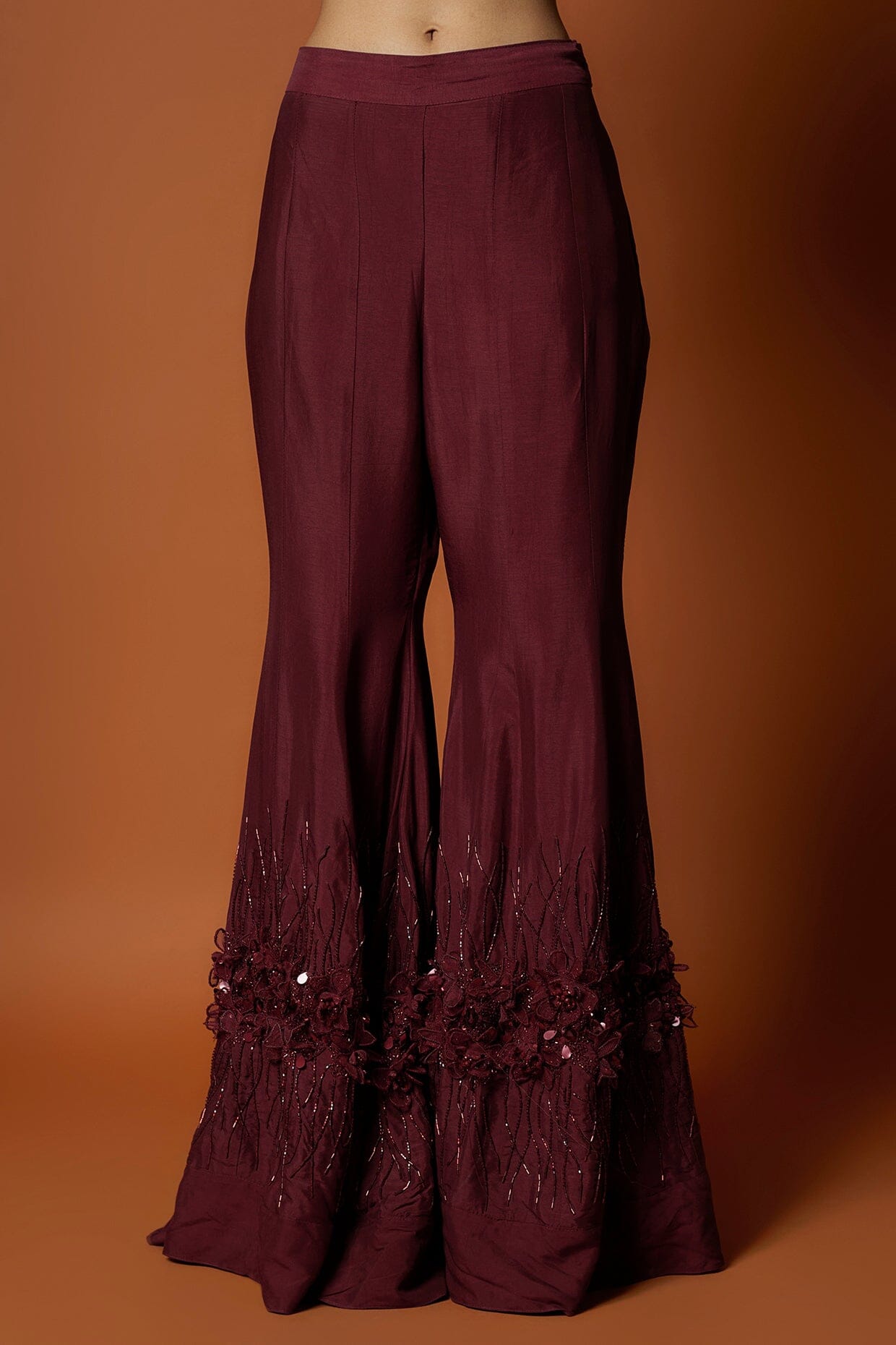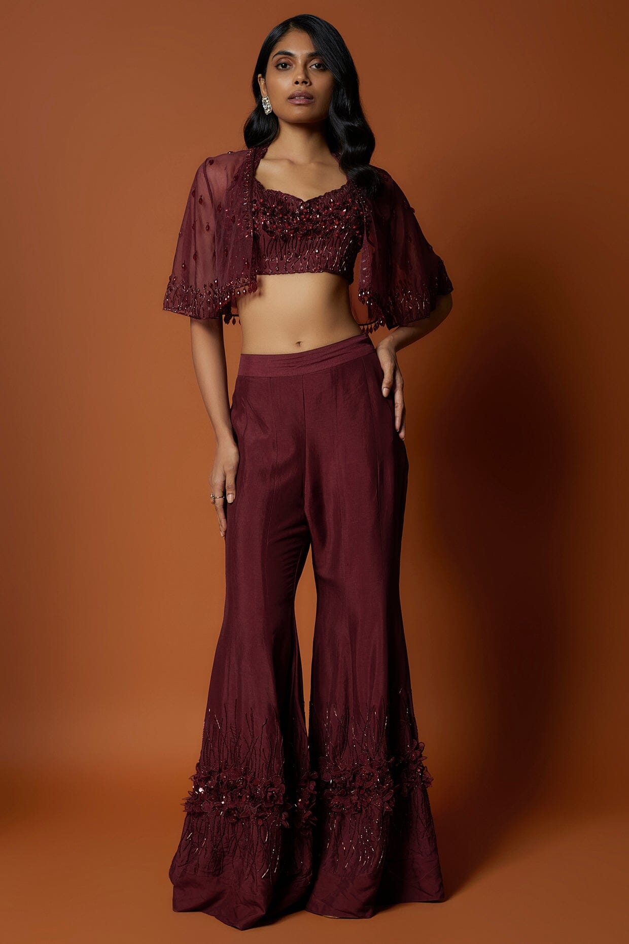 Maroon Red Embroidered Choli Sharara Short Jacket Set