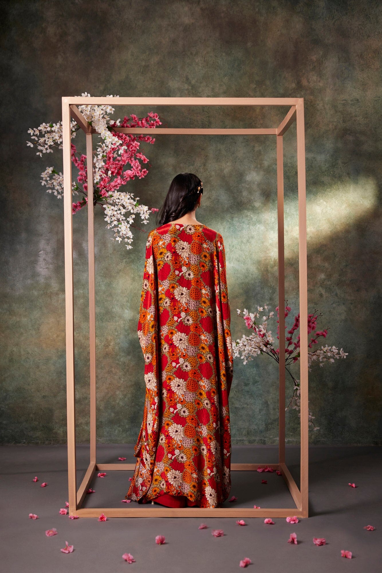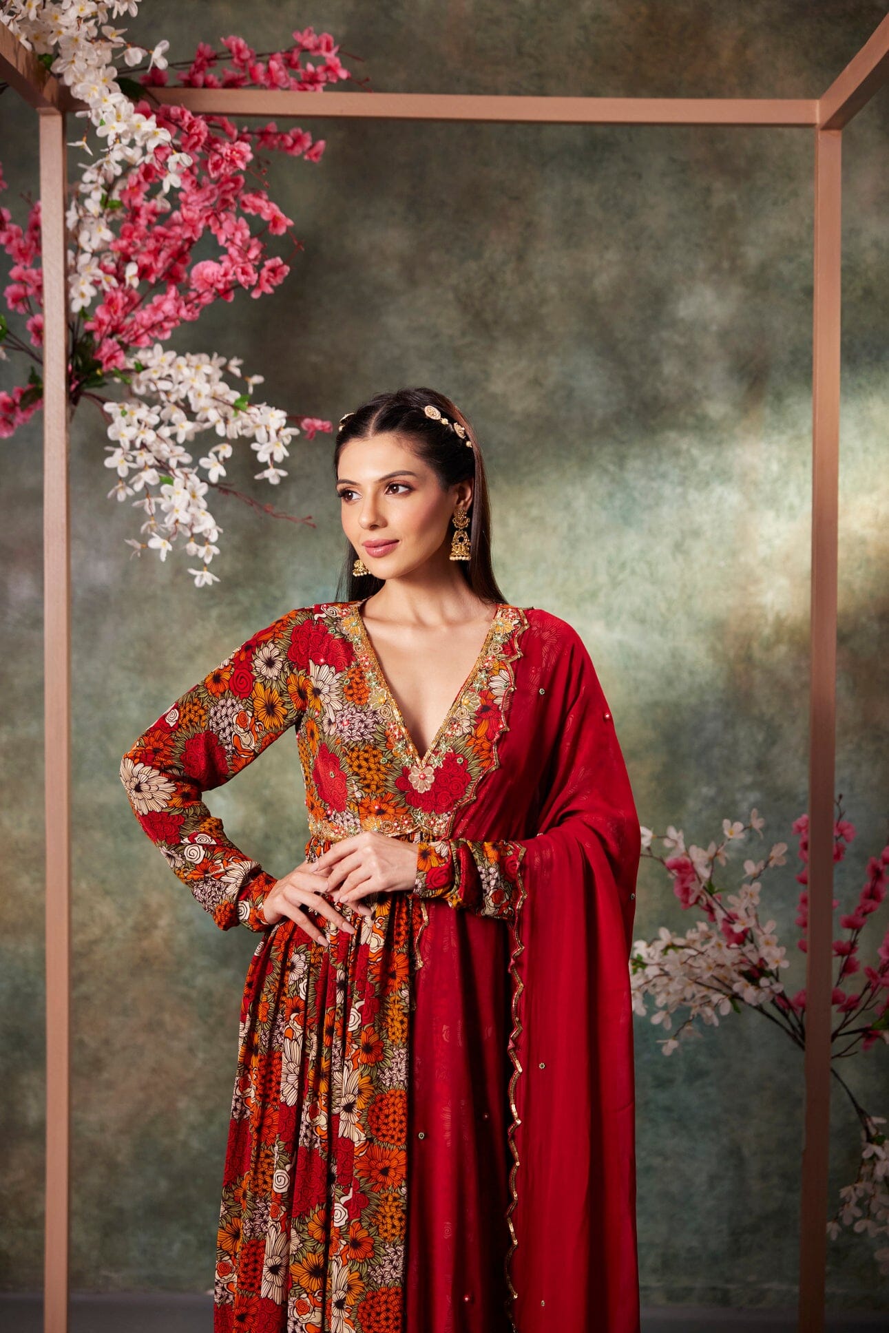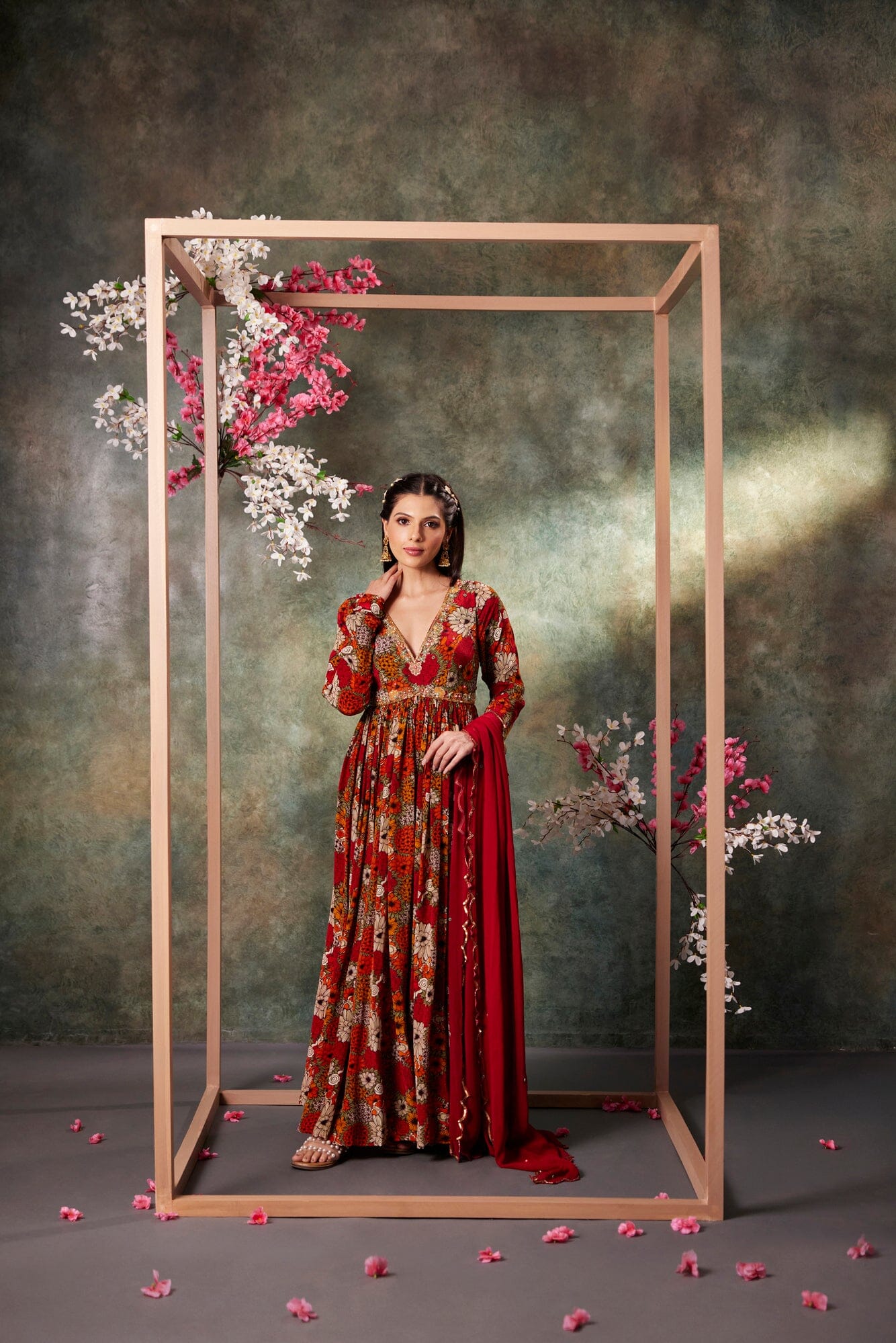 Orange Printed Anarkali And Dupatta Set With Embroidery