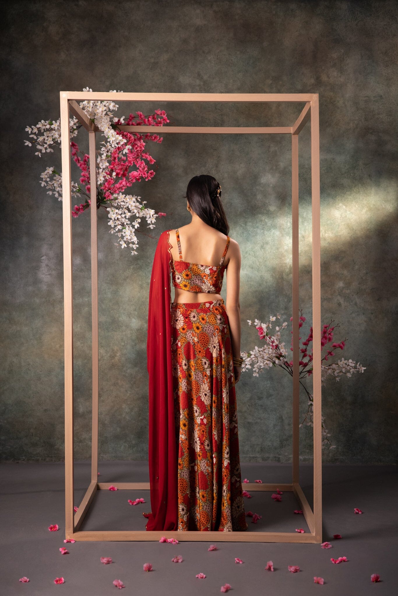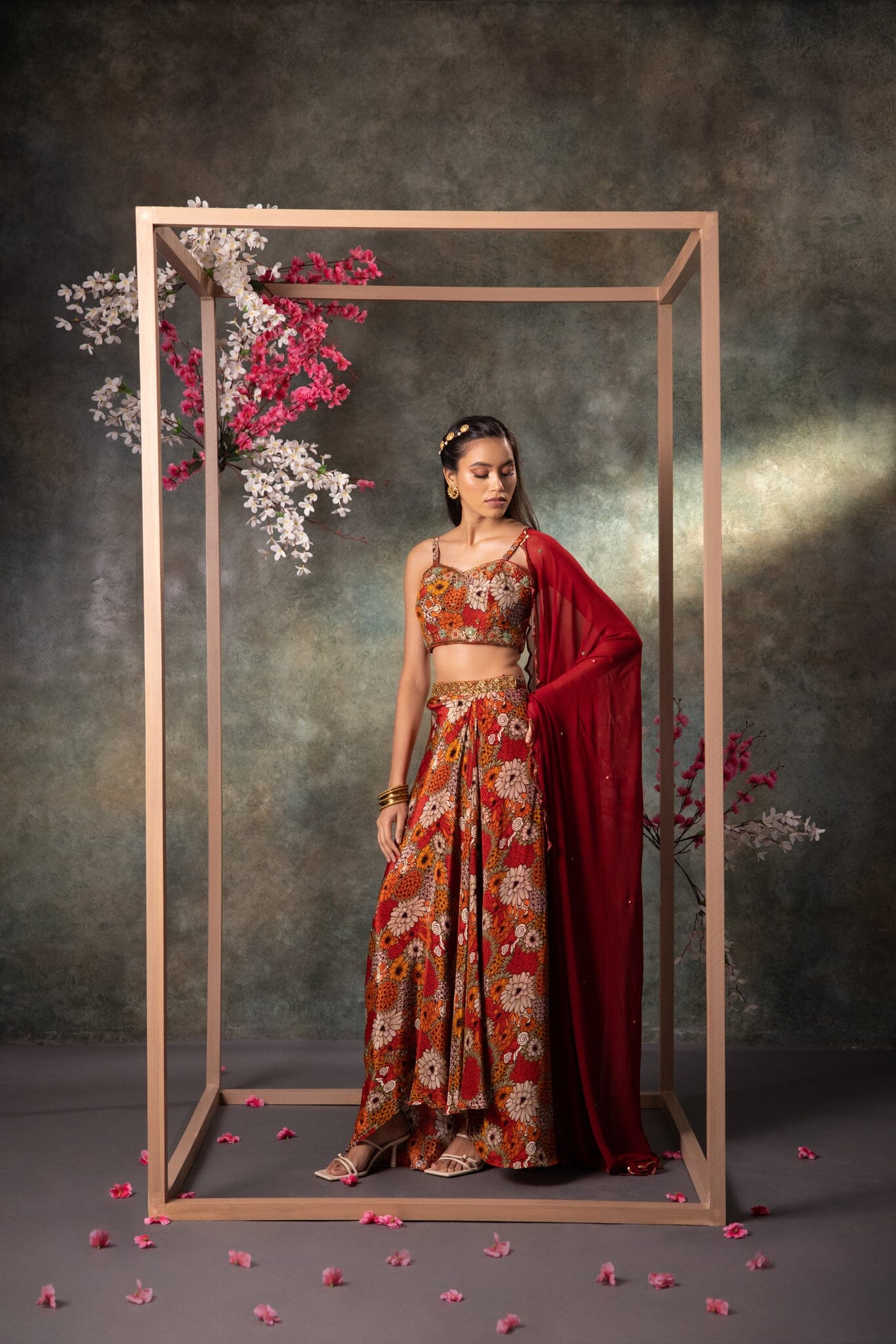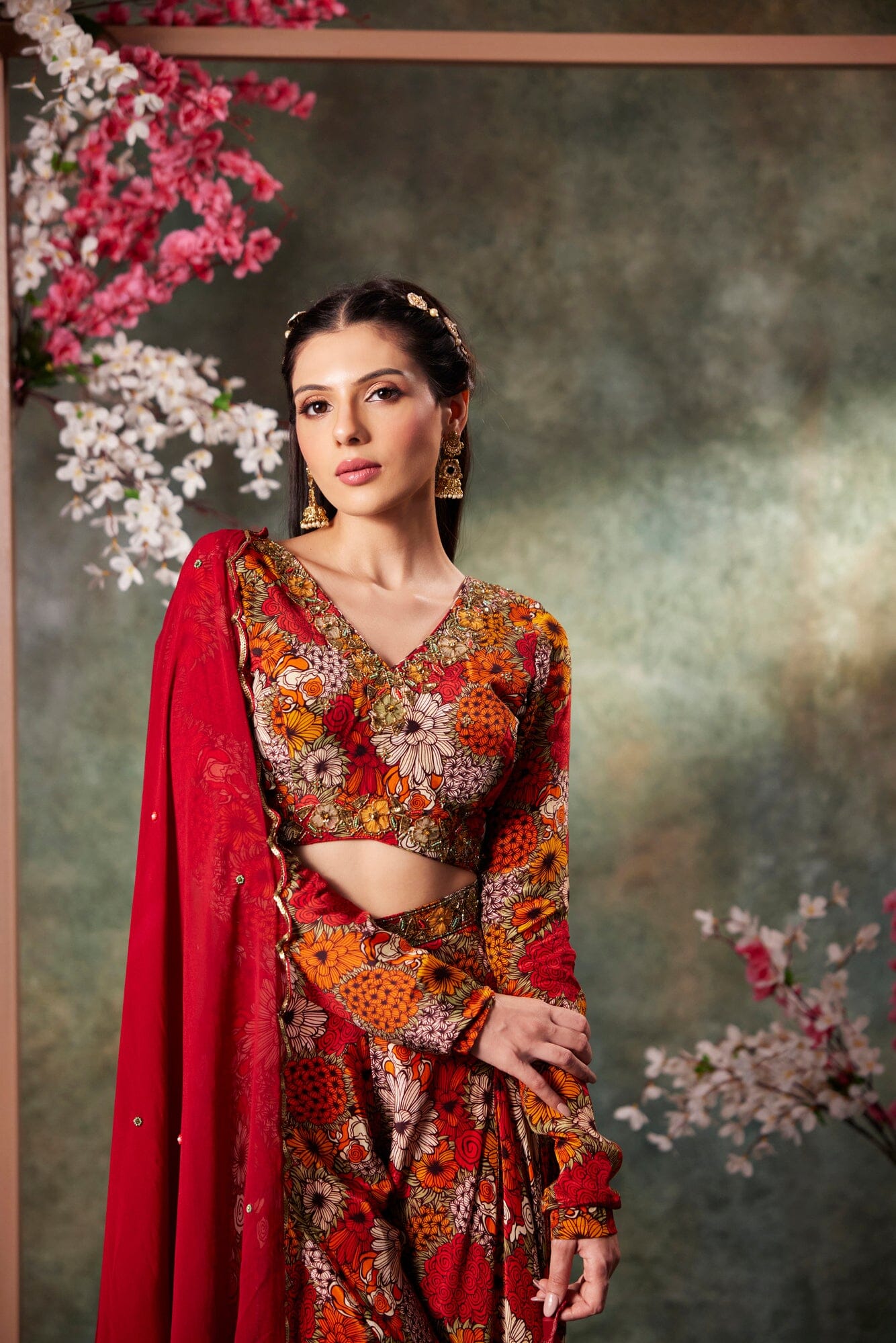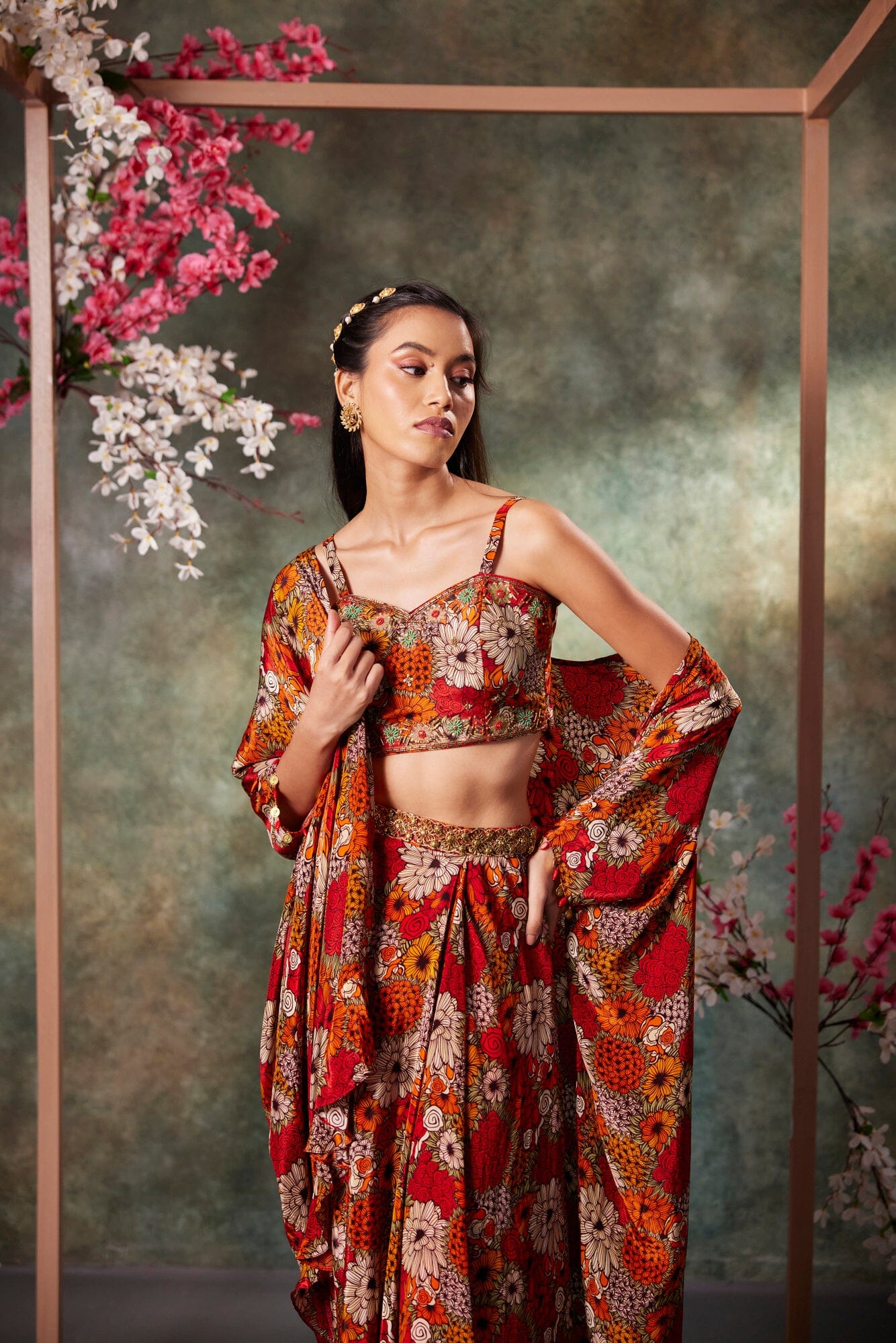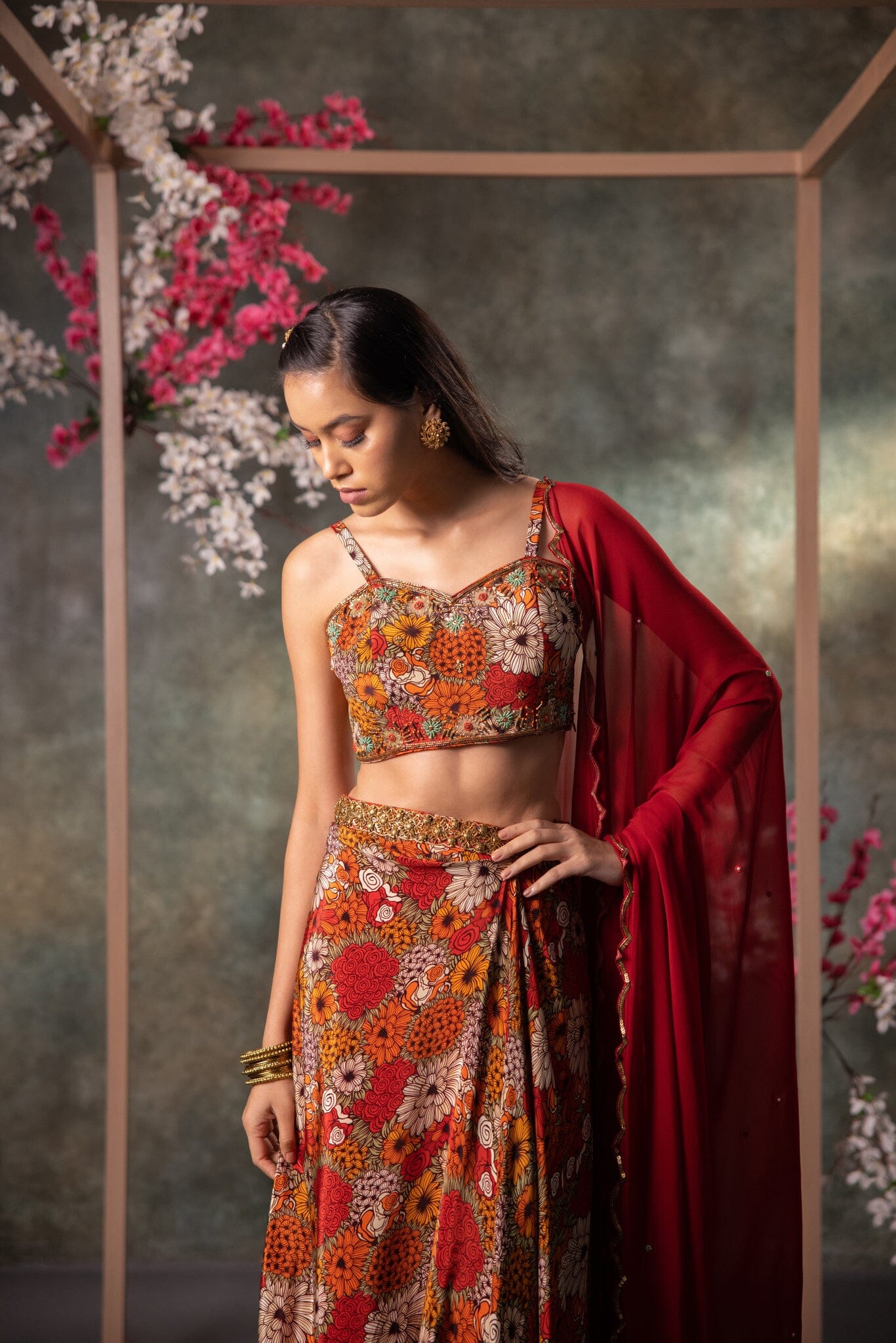 Orange Printed Choli And Pre Draped Saree Set With Embroidery