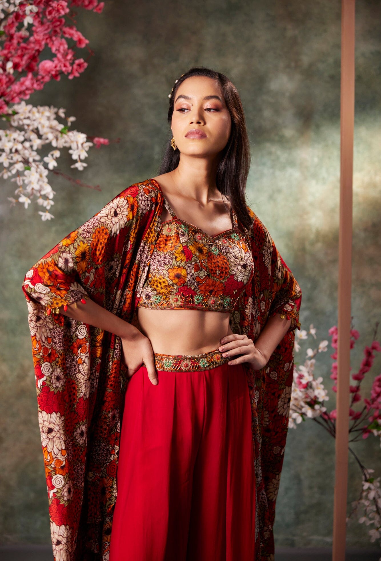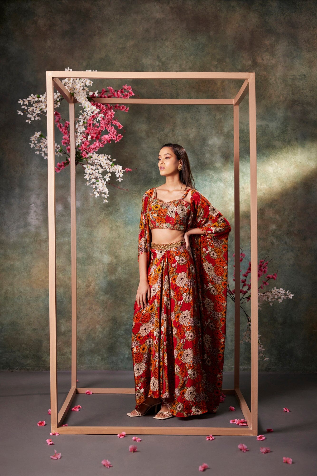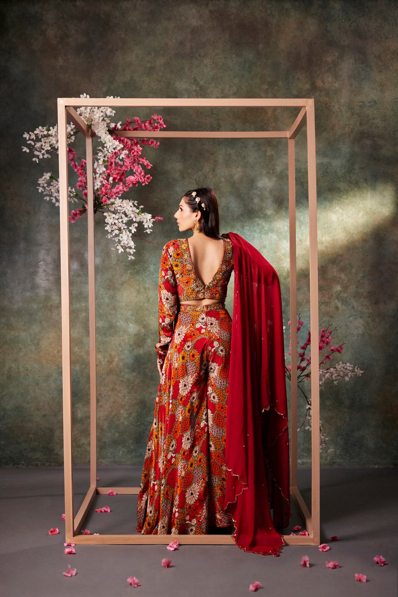 Orange Printed Choli, Pants And Jacket Set With Embroidery