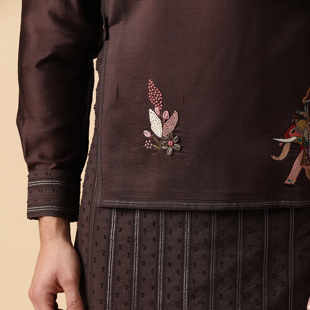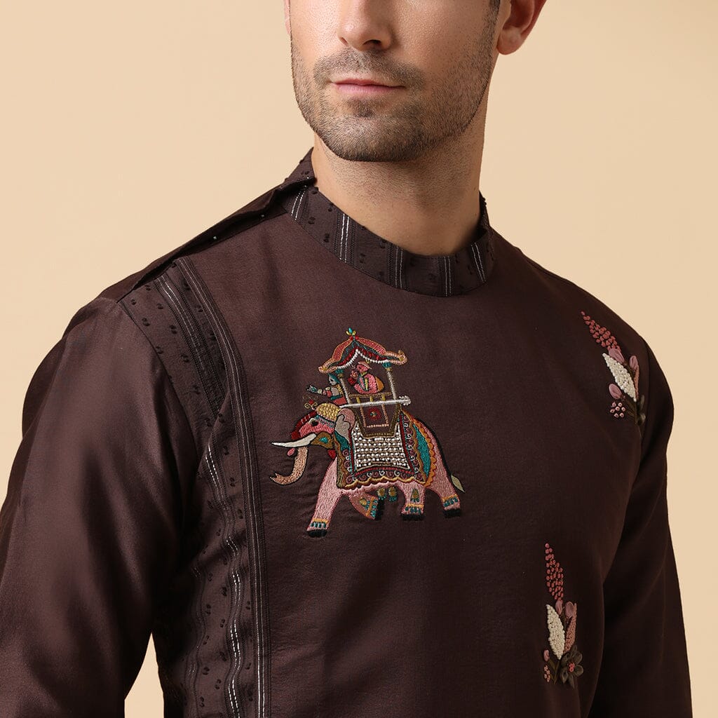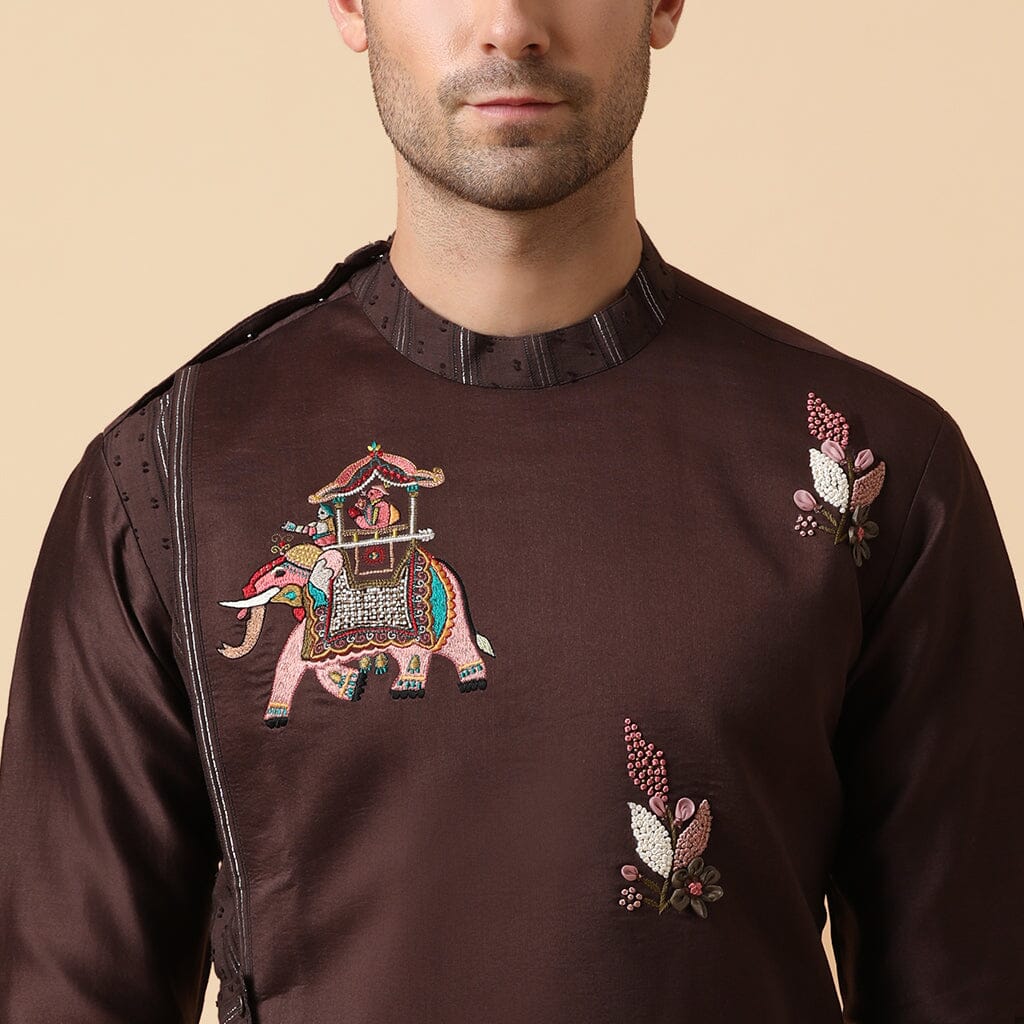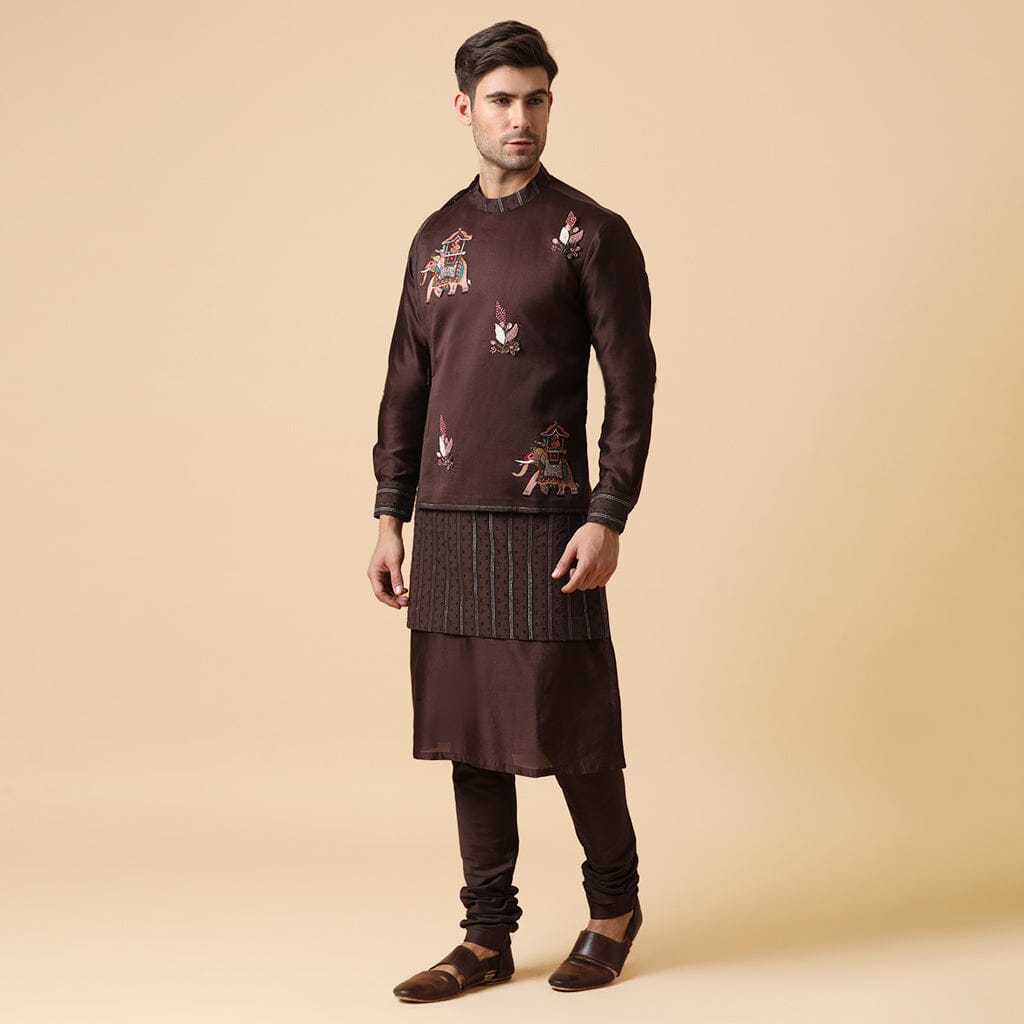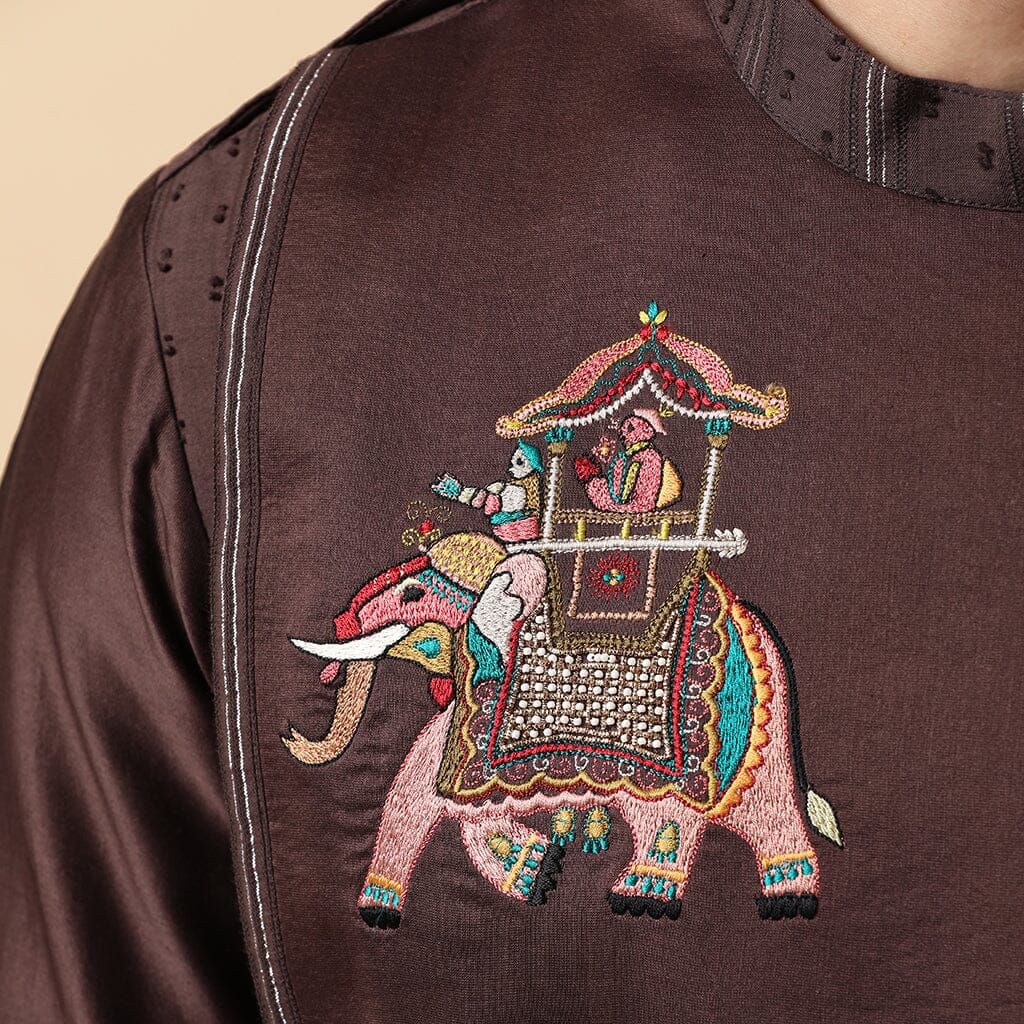 Juego de chanderi kurta de 3 paneles con bordados del elefante airawat y un intrincado trabajo hecho a mano con chooridar. Puede ser usado por un novio para Sangeet o como invitado a una boda en cualquier evento o fiesta del sur de Asia.