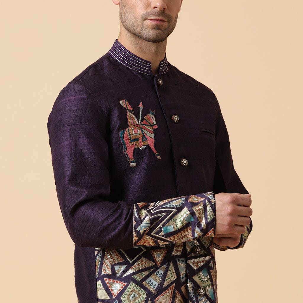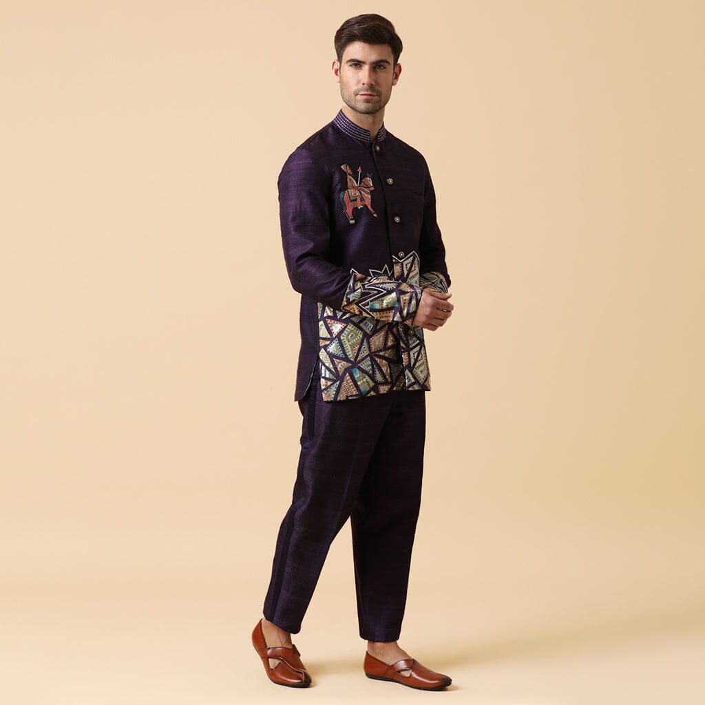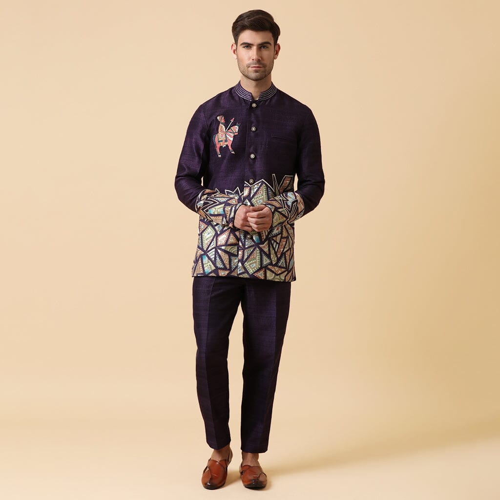 Bandhgala de seda cruda con pantalones de seda cruda. Bordado de caballo guerrero en el pecho y apliques en el dobladillo.
