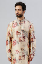 Con kurta beige en base de seda con estampado floral, bordado y botones potli. Este contiene solo una pieza.