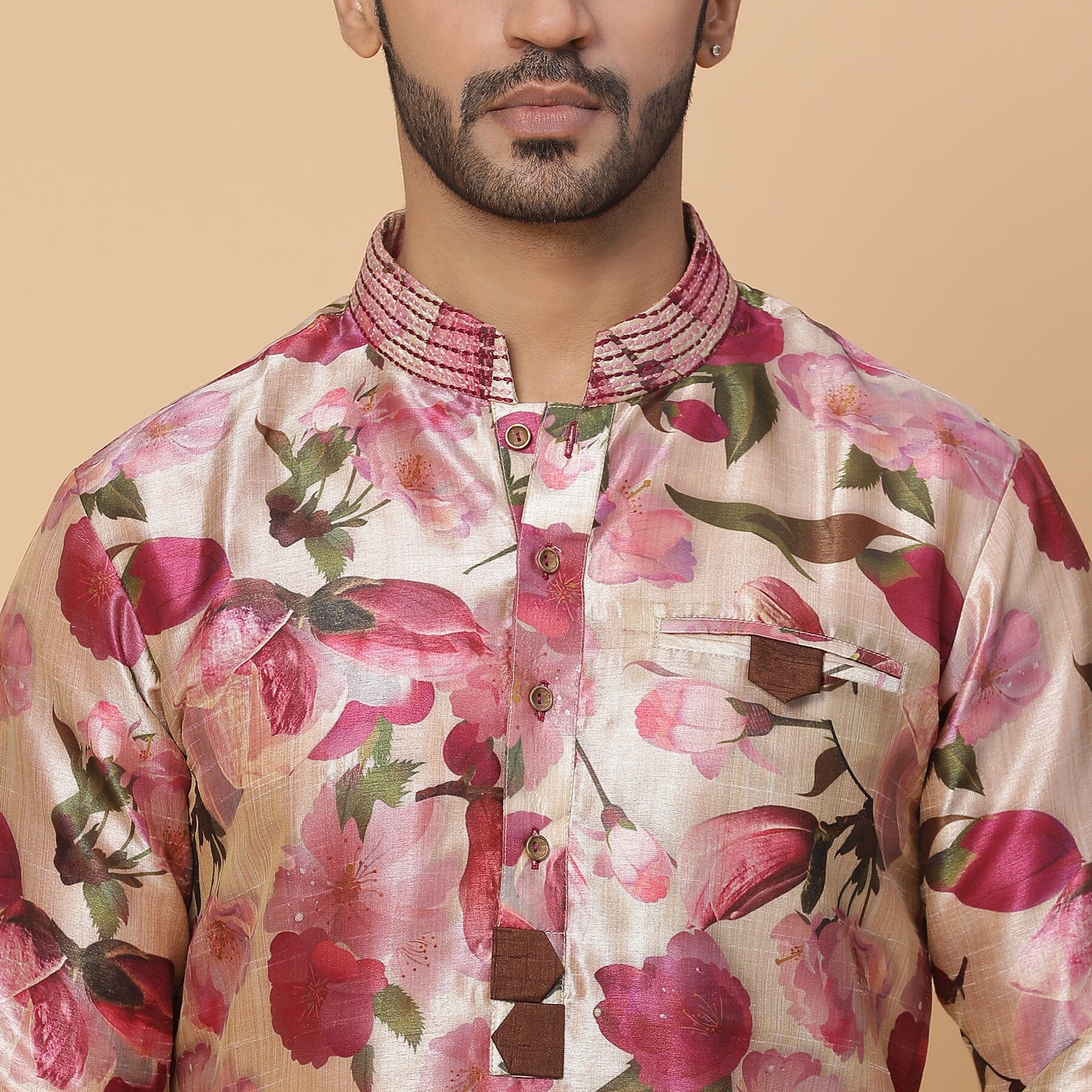 Una kurta de seda en flor de cerezo con detalle de anclaje en el cuello. Ajuste perfecto para padrinos de boda o invitados a la boda.