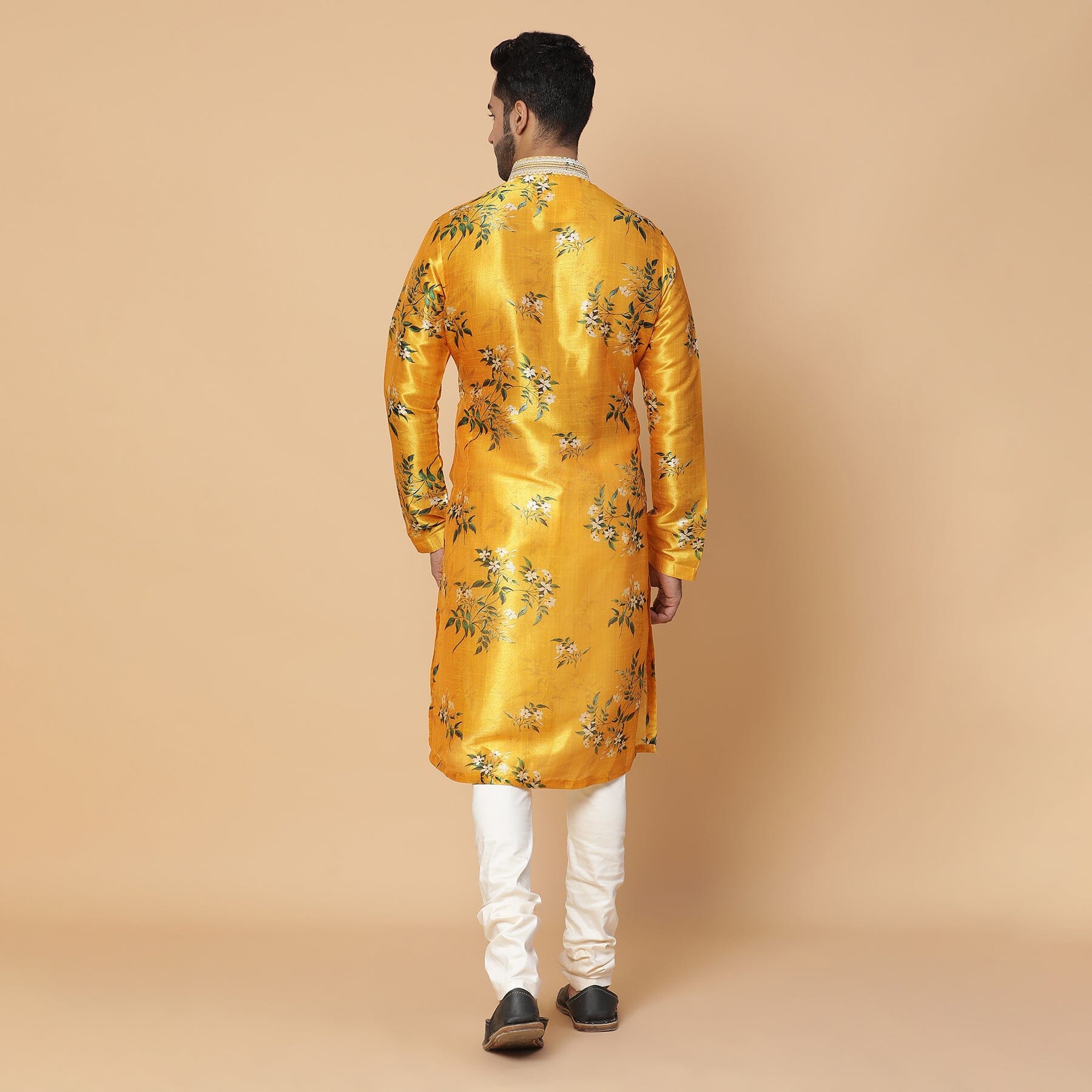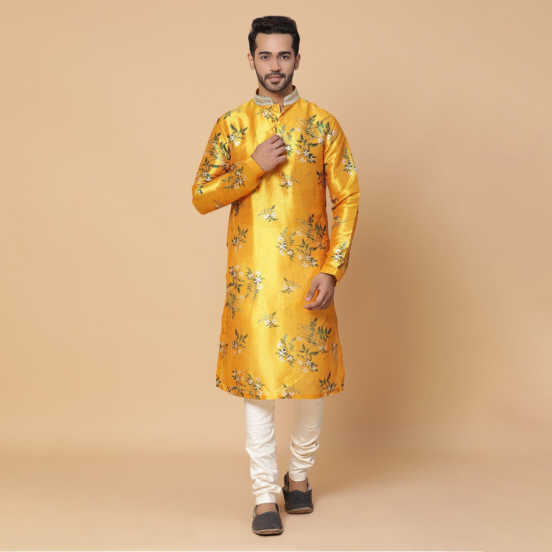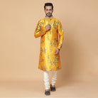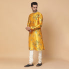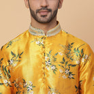 Una kurta de seda con estampado floral amarillo y bordado en el cuello. Ajuste perfecto para padrinos de boda o invitados a la boda.