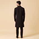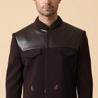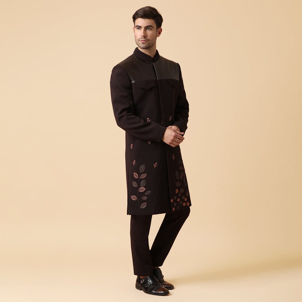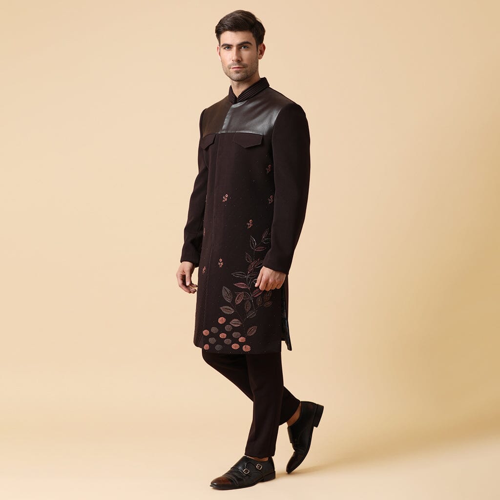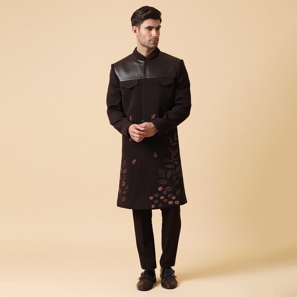 Conjunto indo occidental en una tela de lujo con textura 3D, con pintura a mano y bordado de hilo, un parche de cuero en el pecho y detalles de pliegues en el dobladillo con los mismos pantalones.