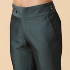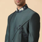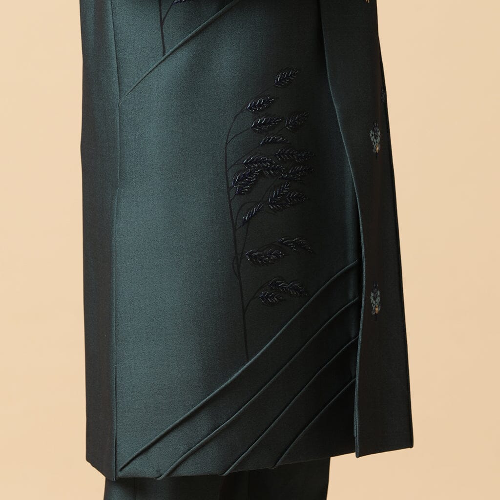 Tela de lujo bicolor verde pintada a mano y adornada con bordados a mano y pantalones del mismo tejido.