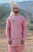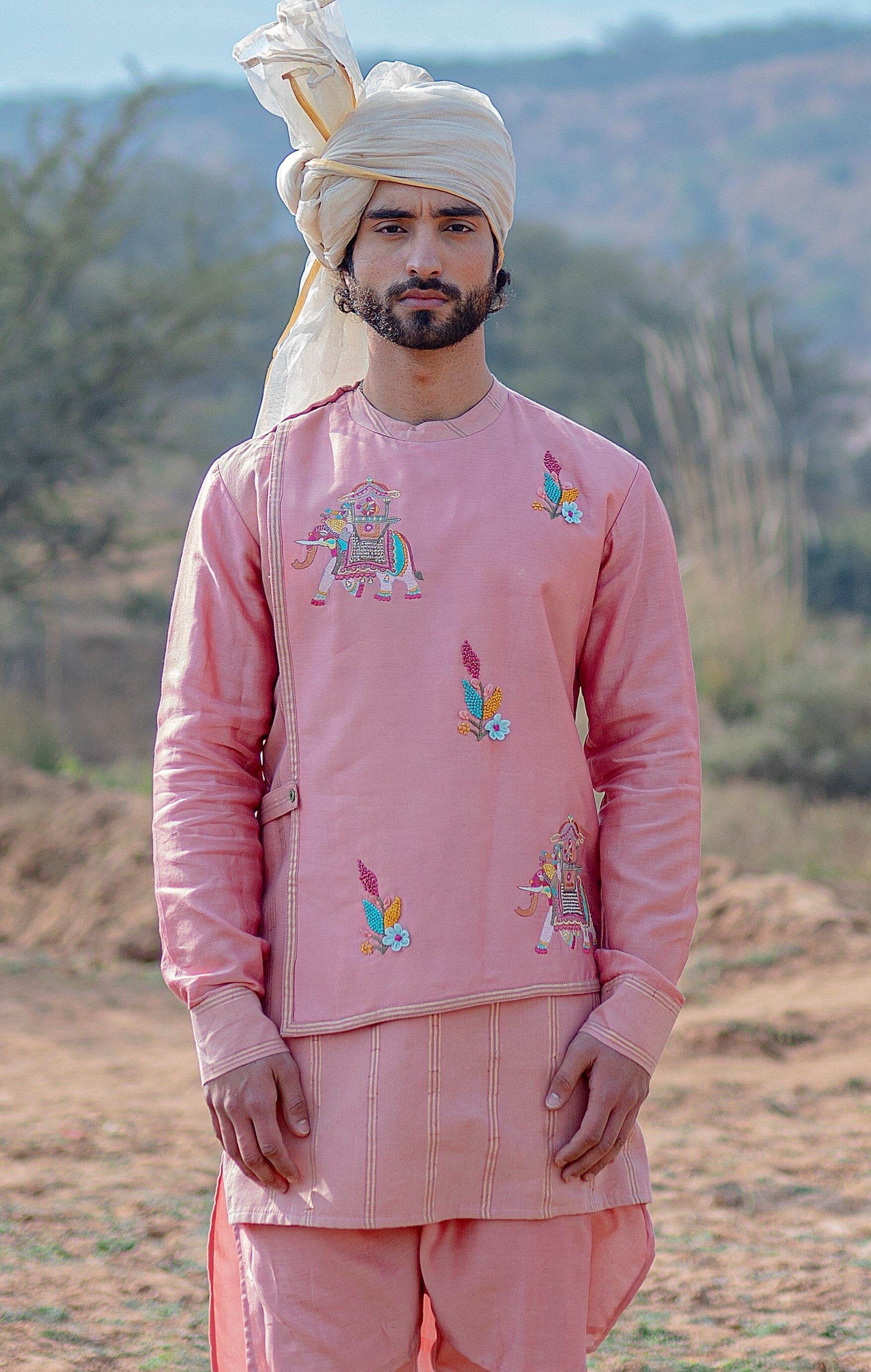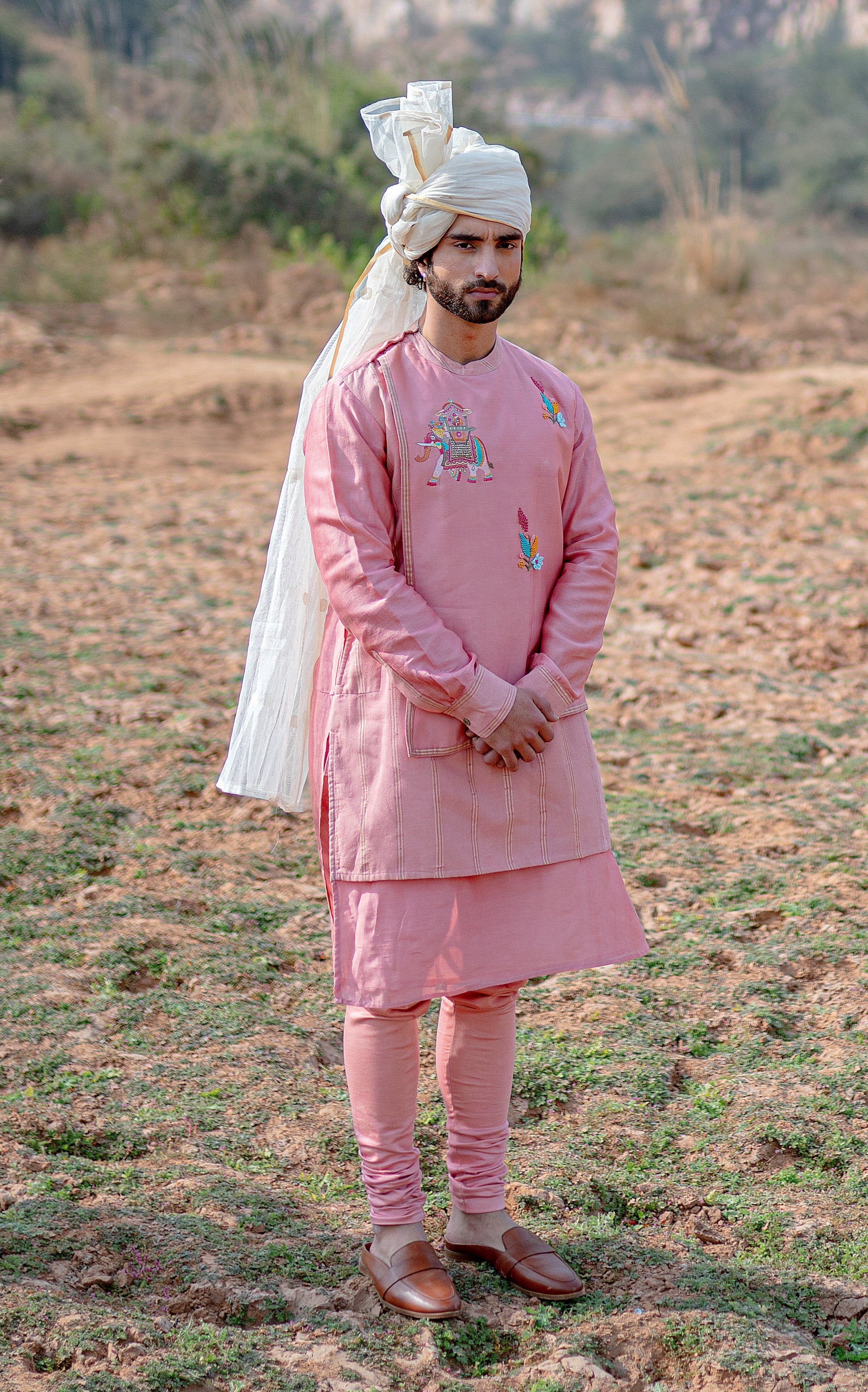 Un conjunto chanderi kurta de 3 paneles de color rosa rubor con bordados de airawat, el elefante, y un intrincado trabajo hecho a mano con chooridar,