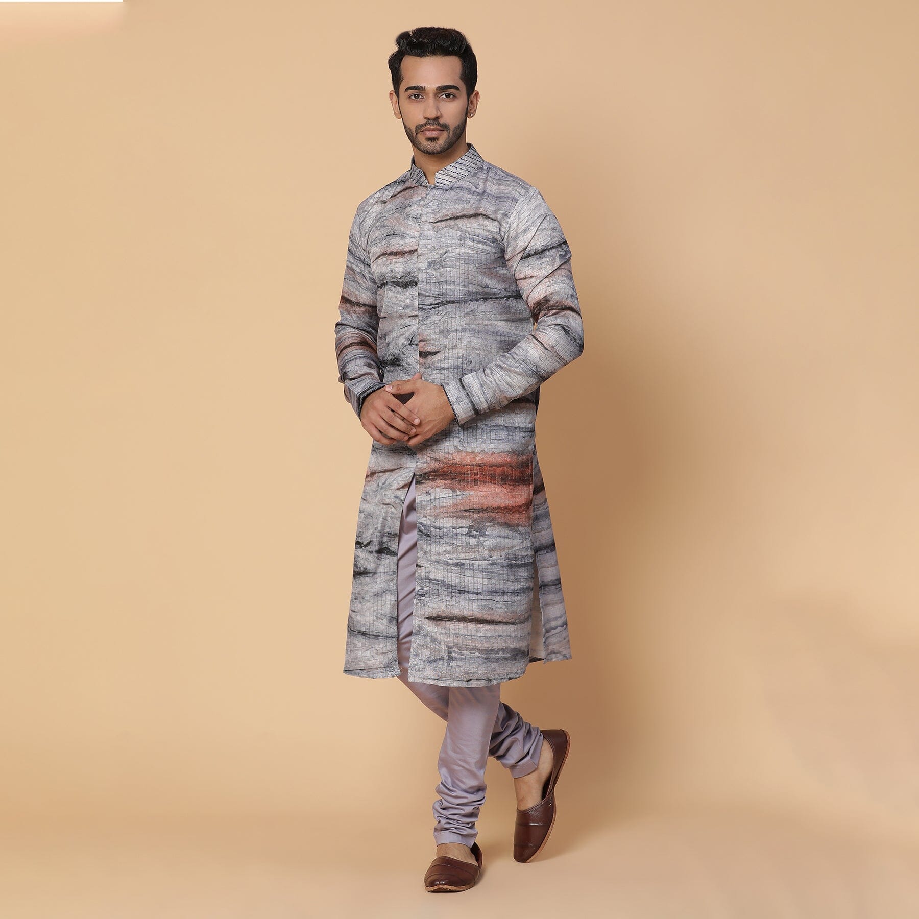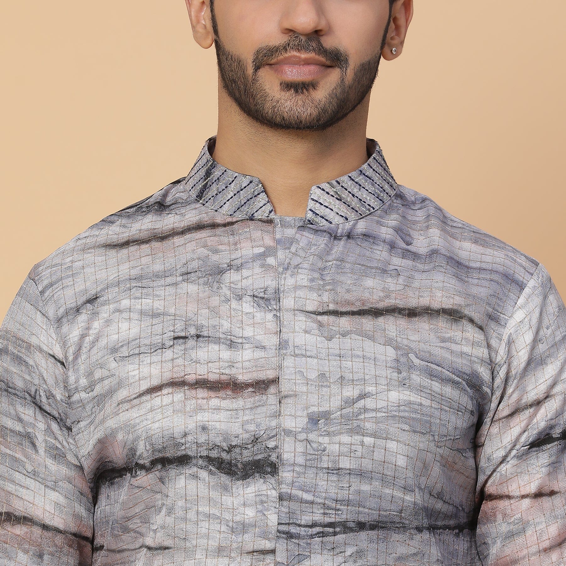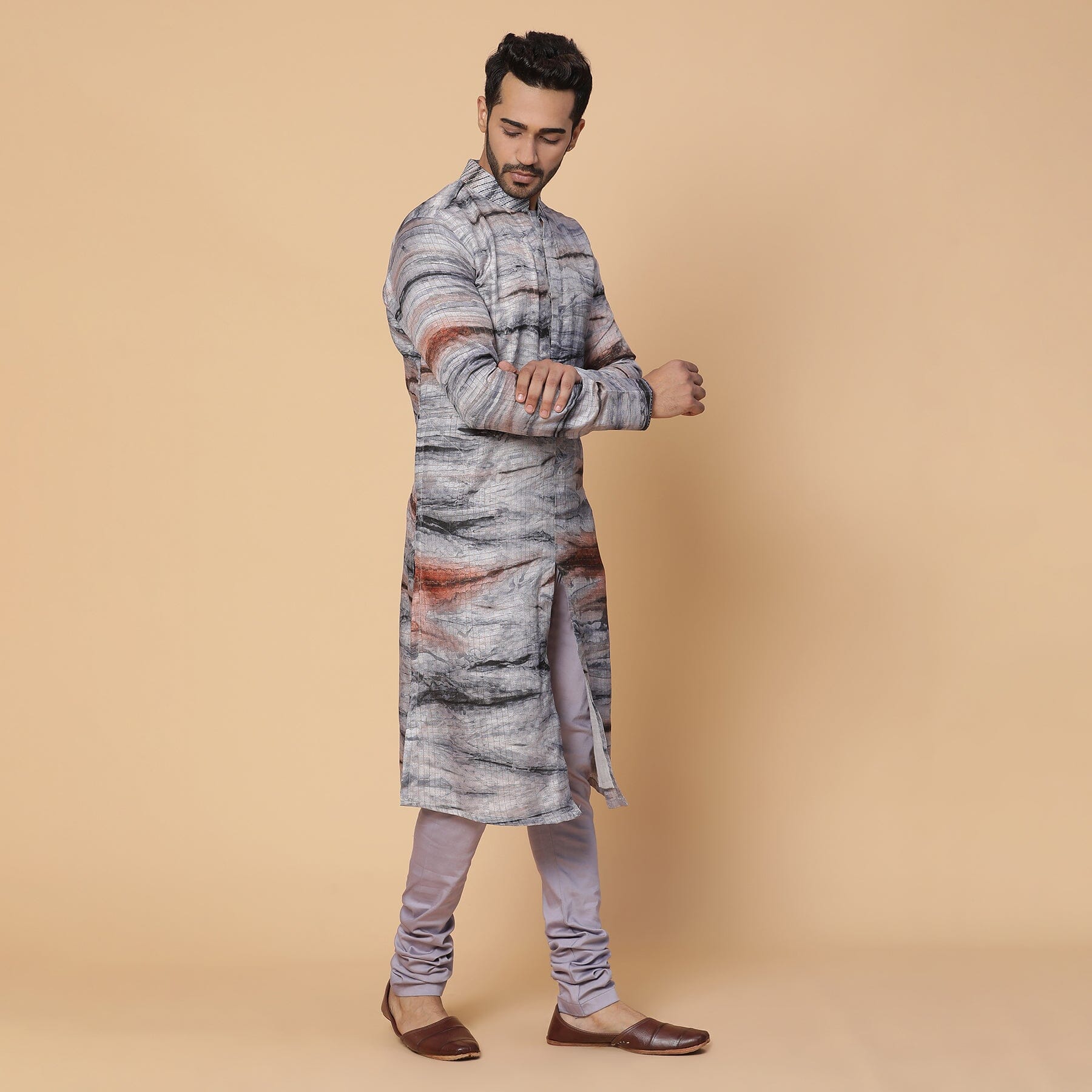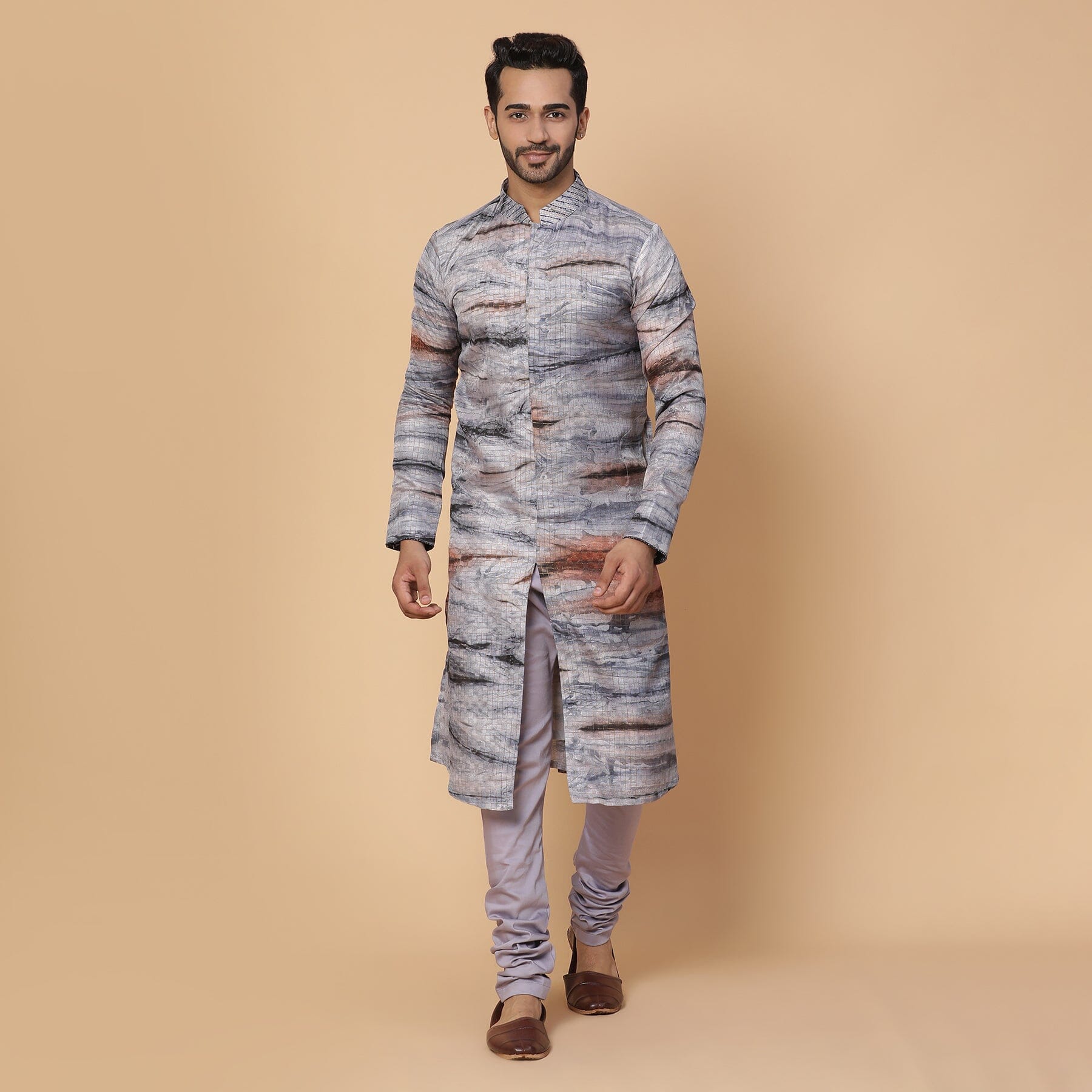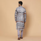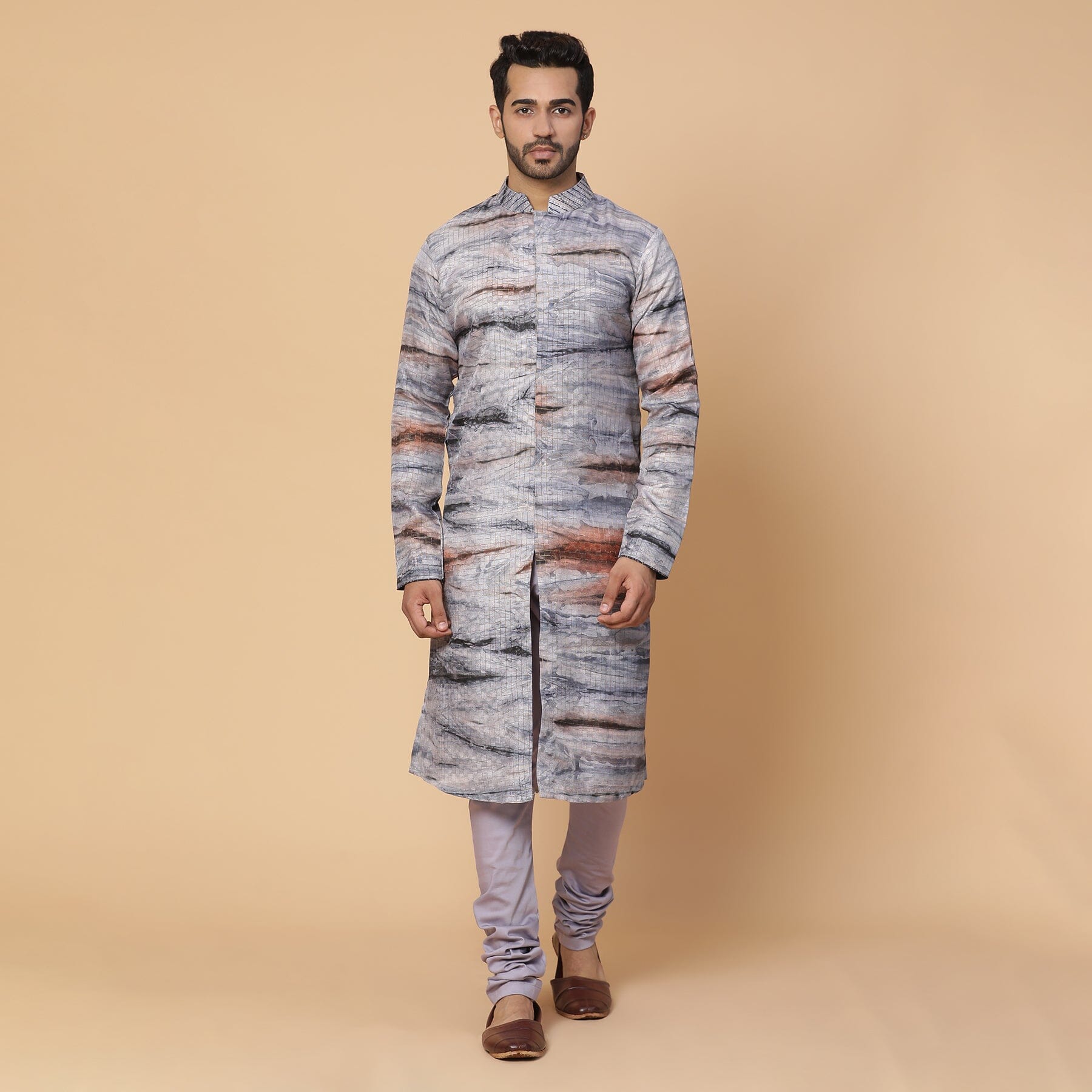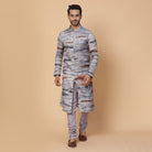 Kurta de seda kota con estampado mármol con churidar de lycra de algodón azul.