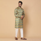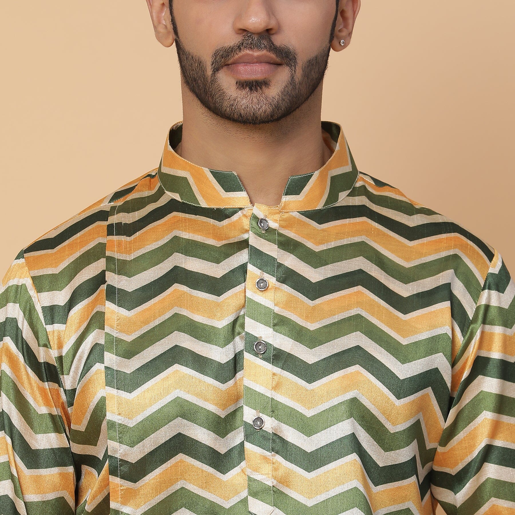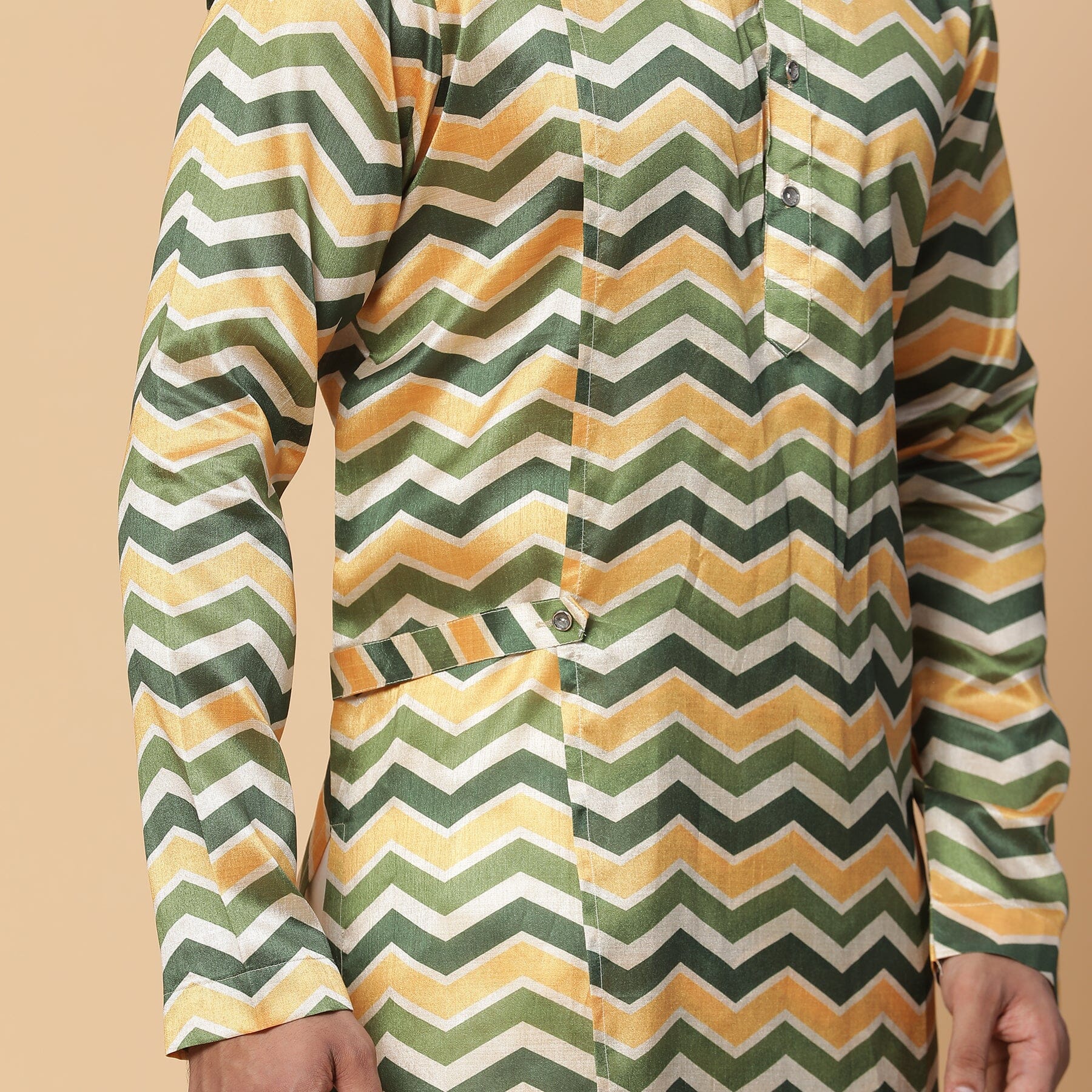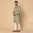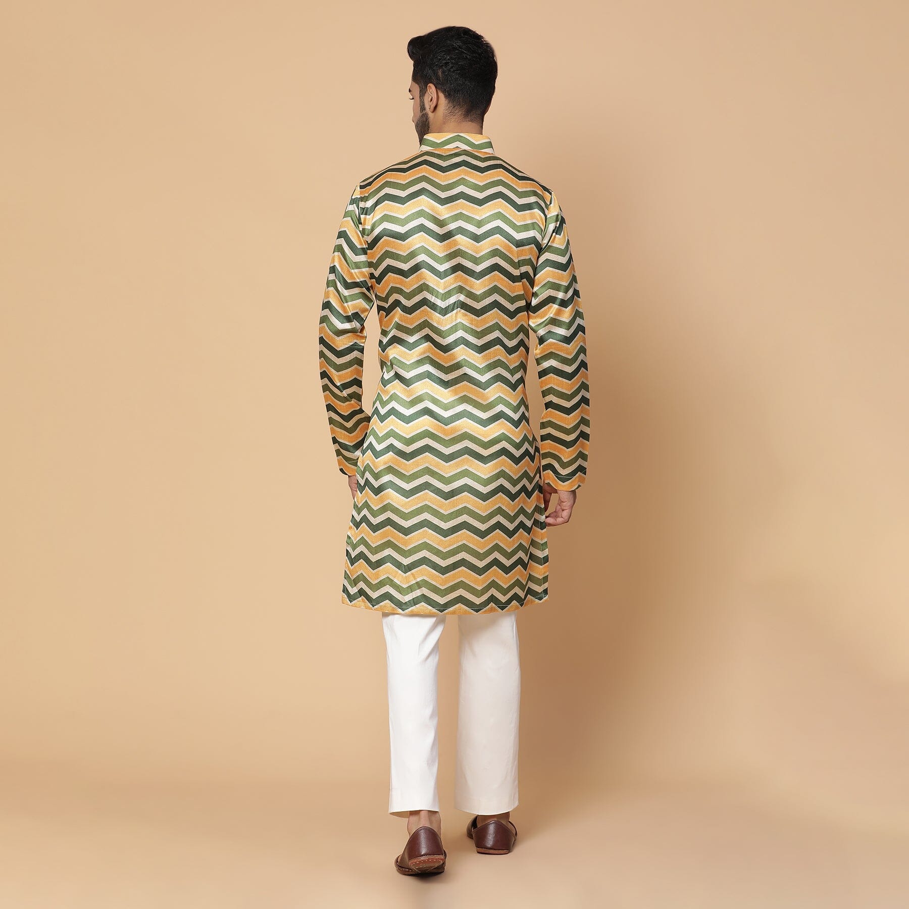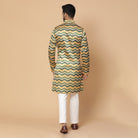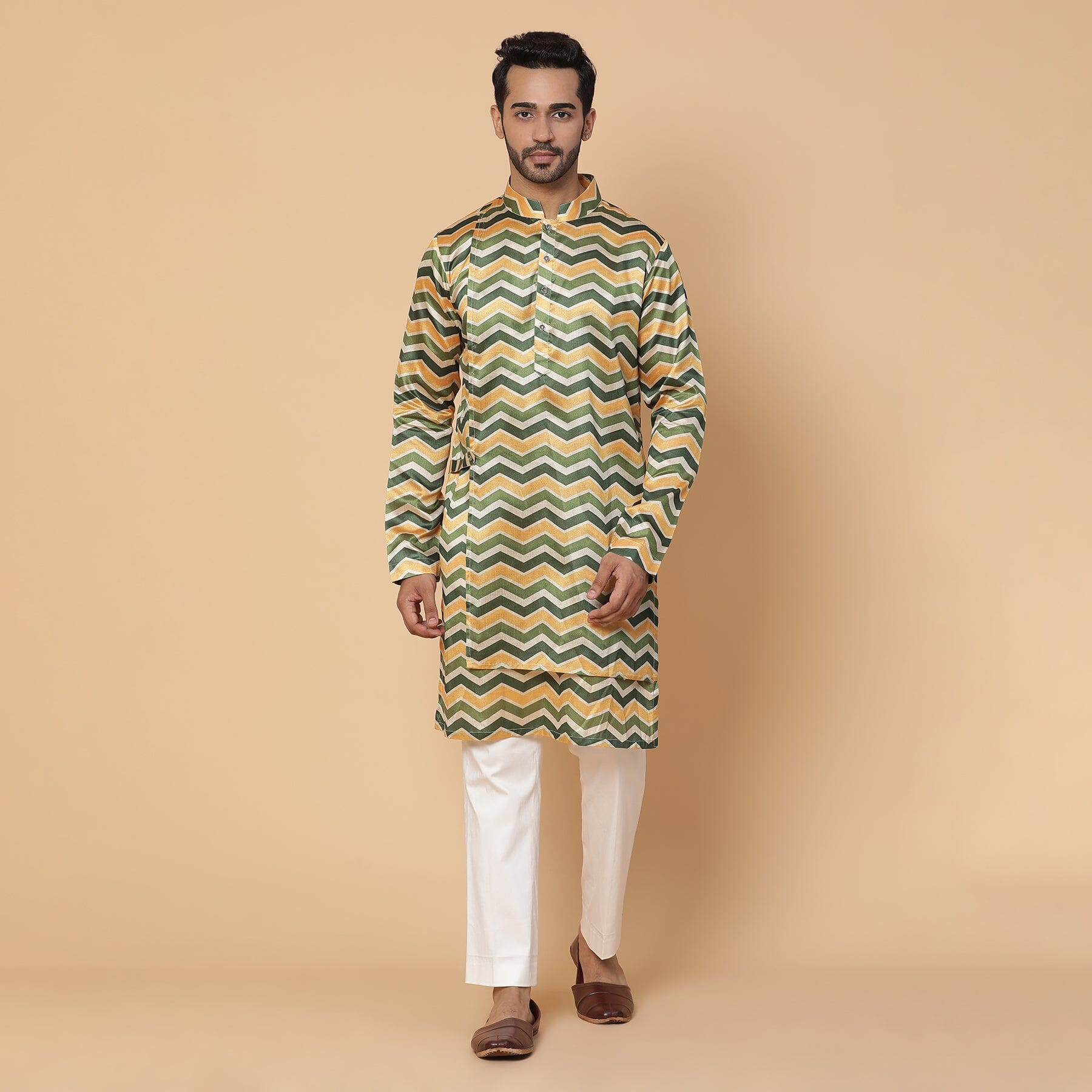 Una kurta con estampado de seda con el panel superpuesto. La tela multicolor es perfecta para los padrinos de boda o los invitados a la boda.
