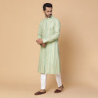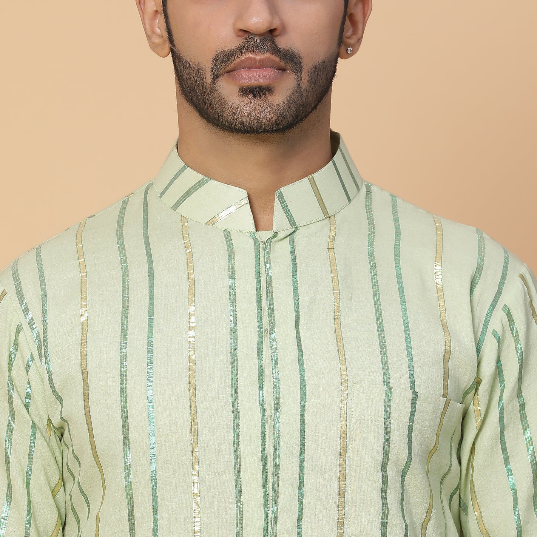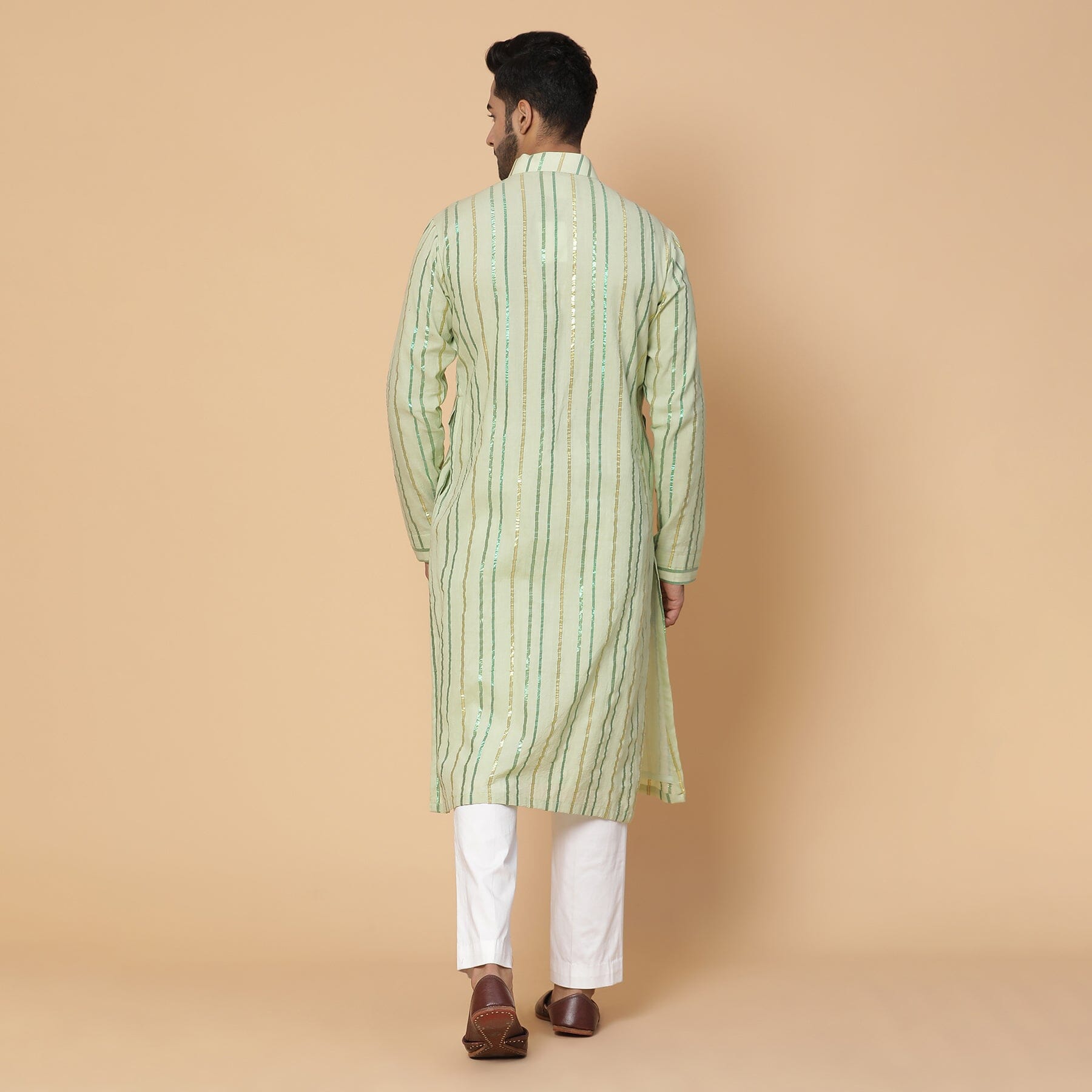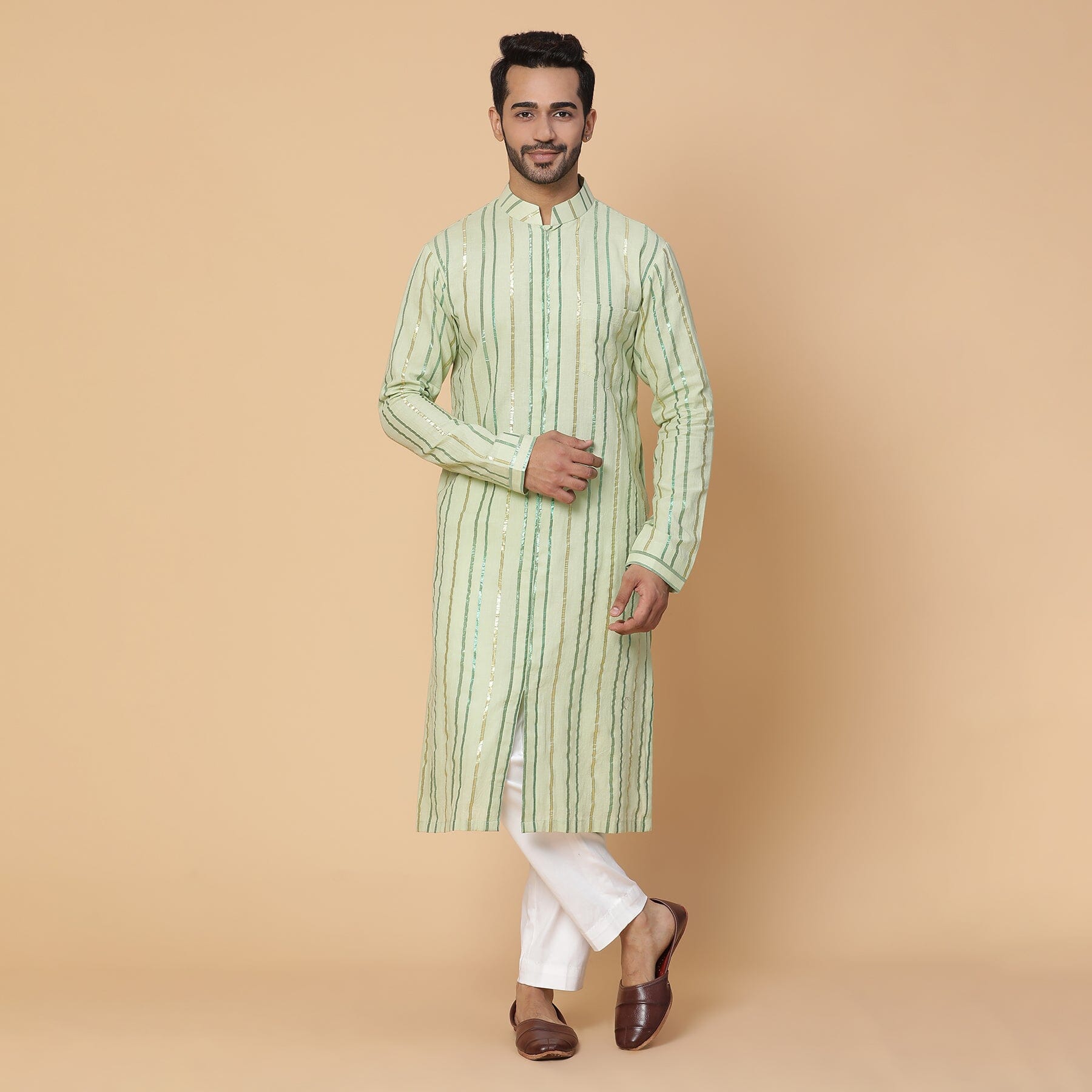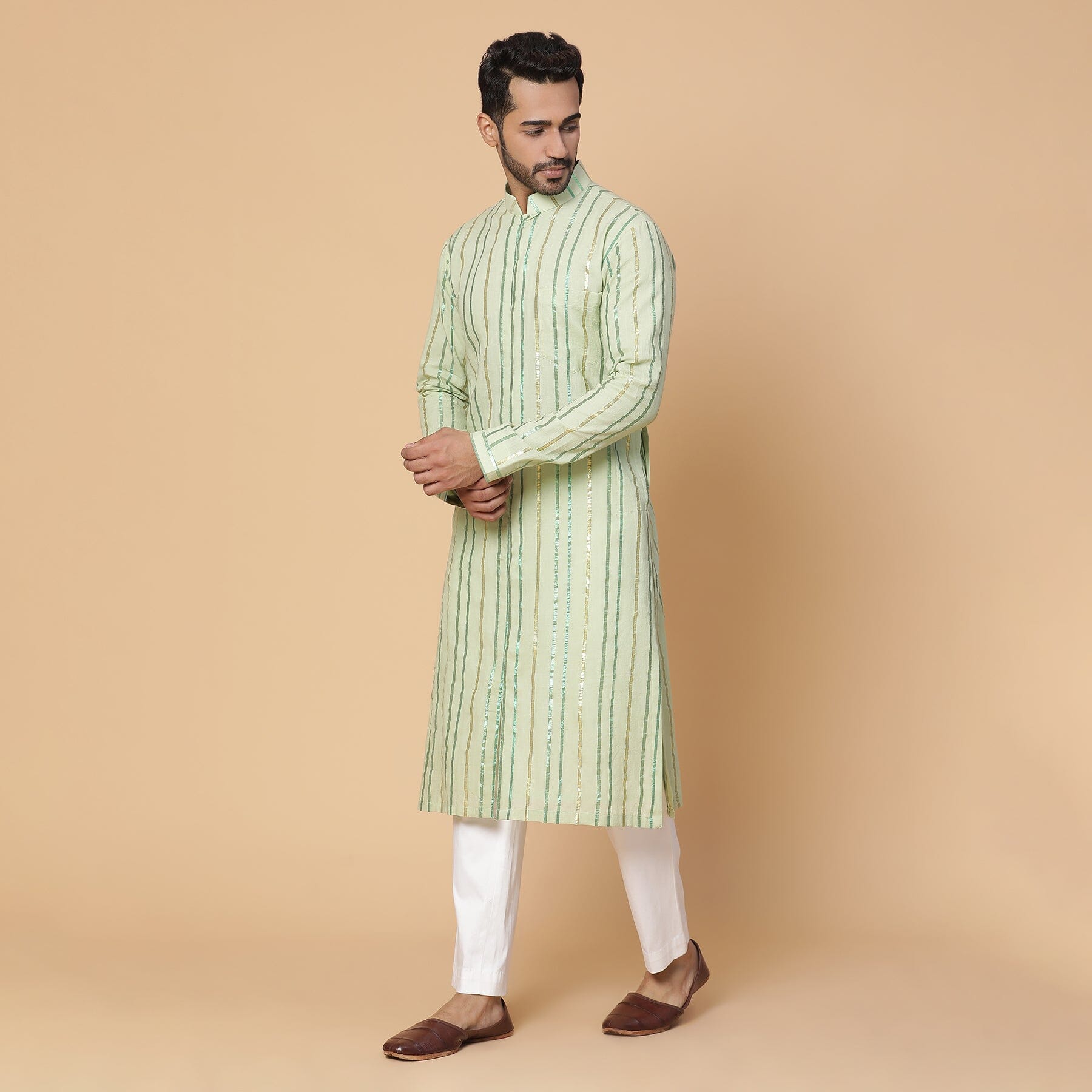 Una kurta primaveral perfecta de color verde mar con rayas doradas y verdes de lurex con pantalones blancos. Perfecta para un Sangeet como novio o como tribu de padrinos de boda.