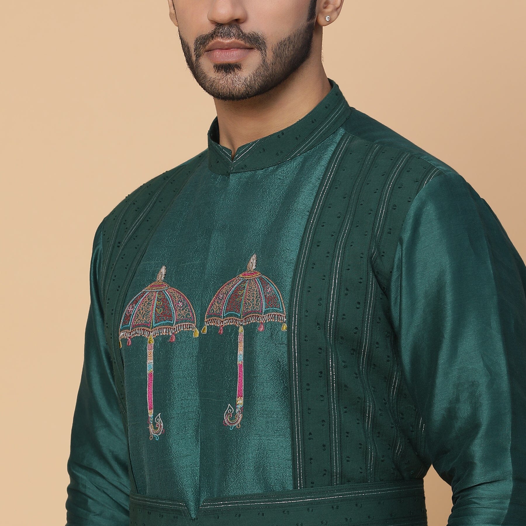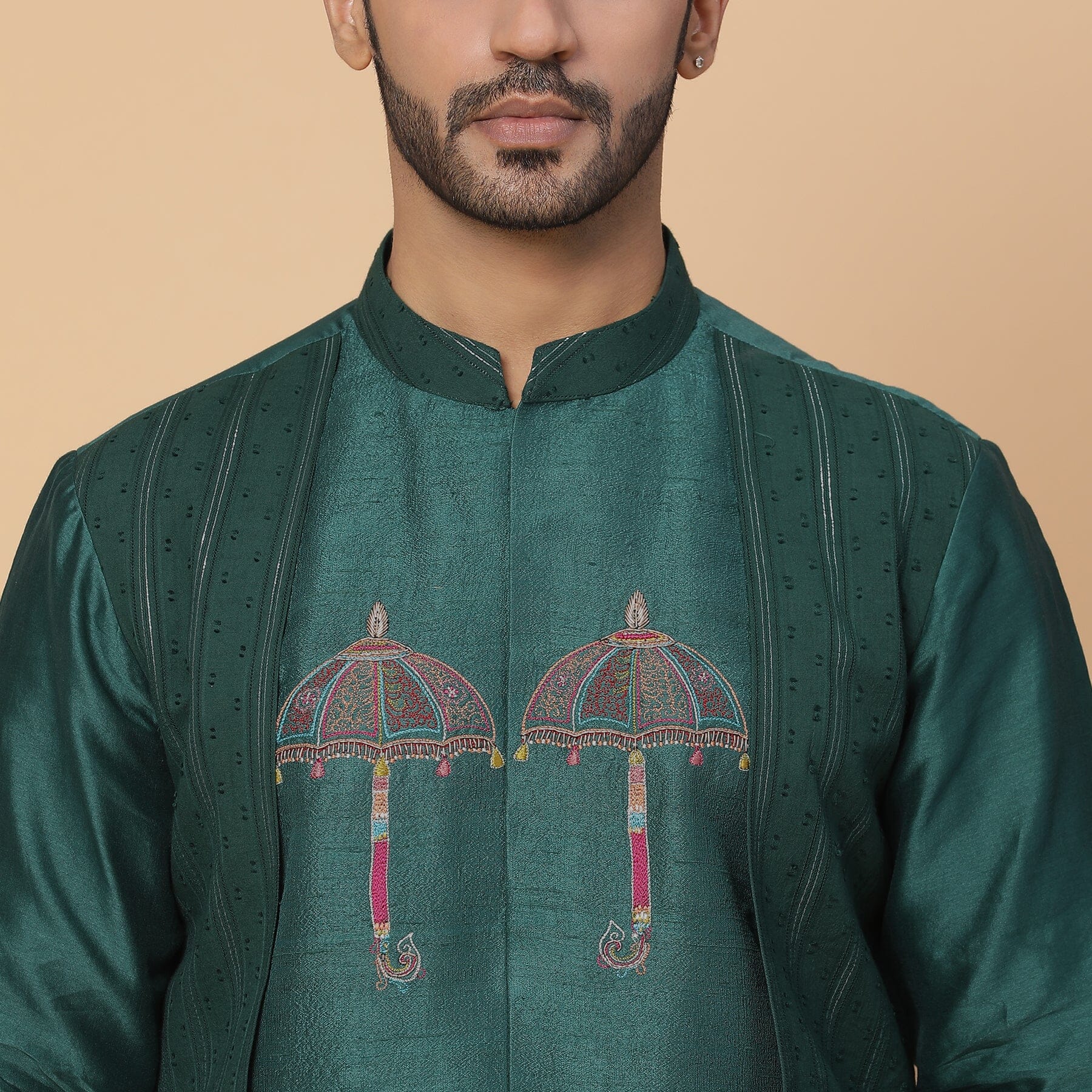 Una kurta muy singular de 3 paneles con bordado de un paraguas inspirado en un carro. Mismo color algodón lycra churidar Tela- algodón chanderi, seda cruda.
