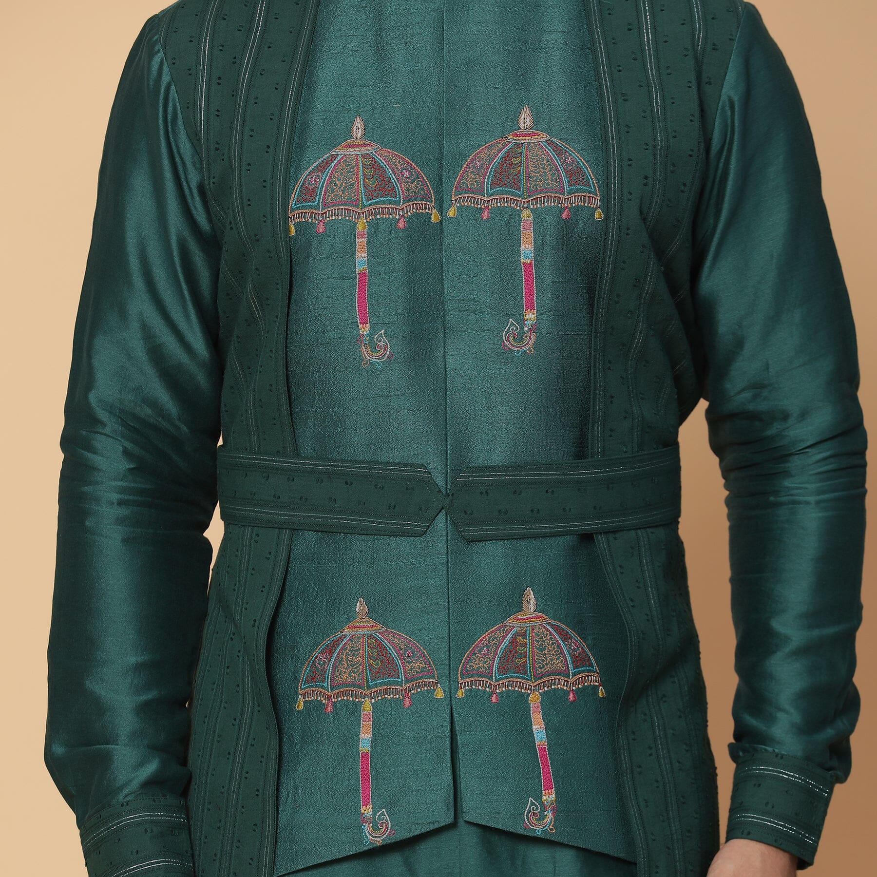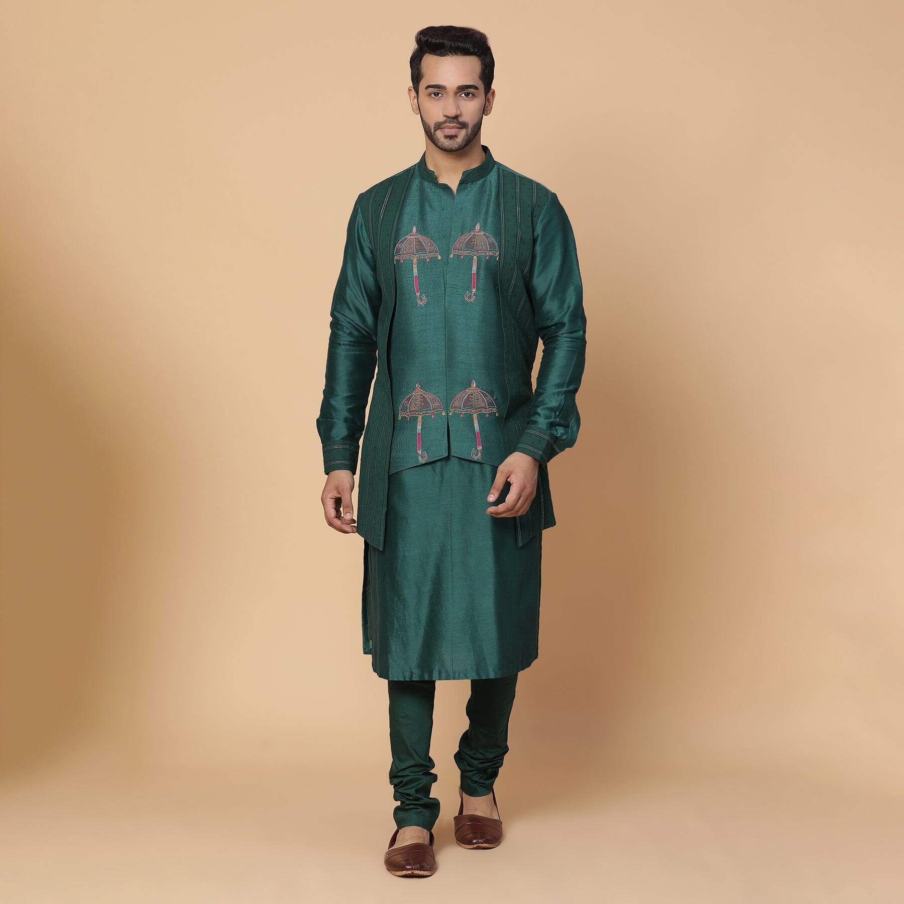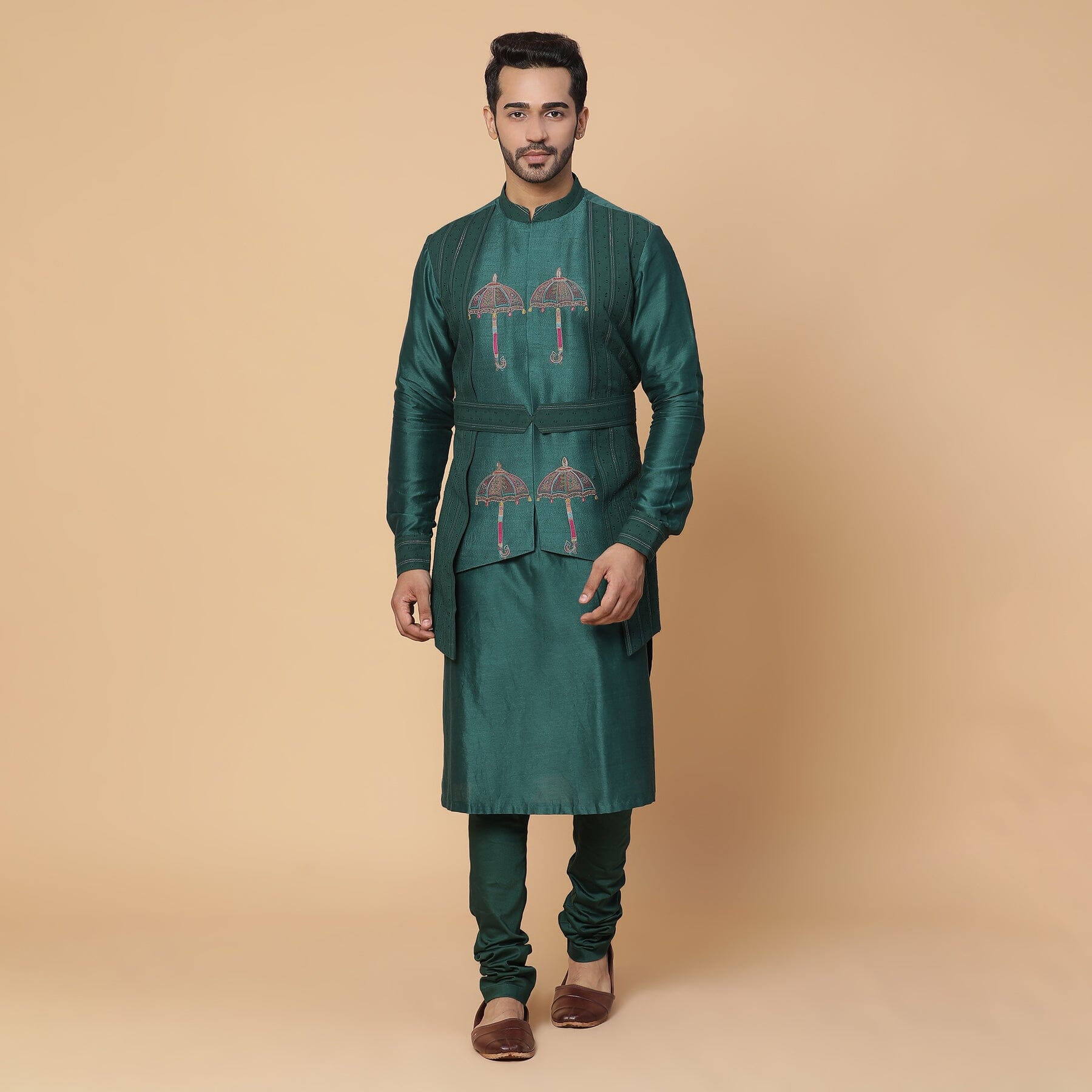 El pavo real es un color brillante y divertido; este conjunto es perfecto para un novio o como hermano de la novia o el novio. Se puede usar para Sangeet o Mehandi para un evento de día o de noche.