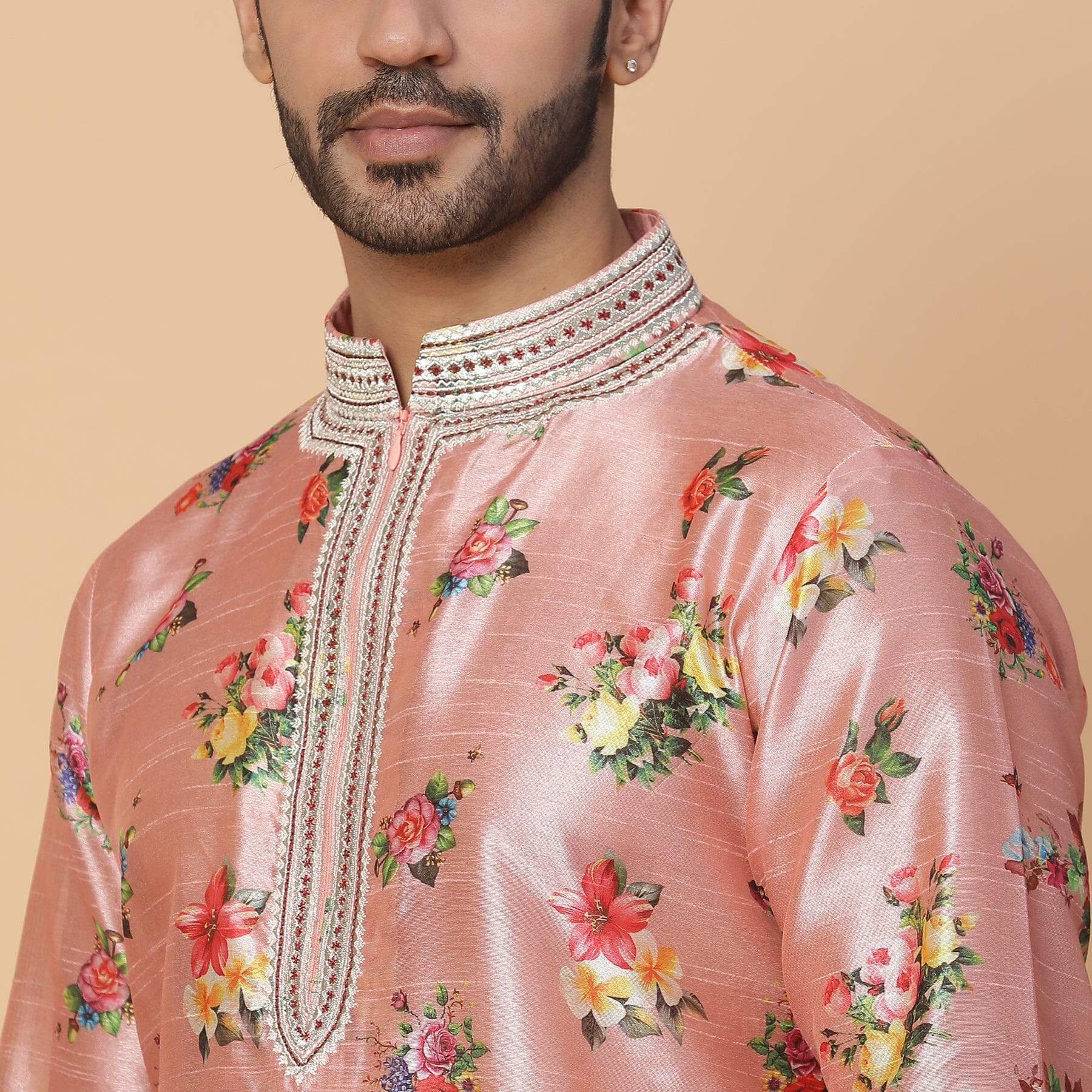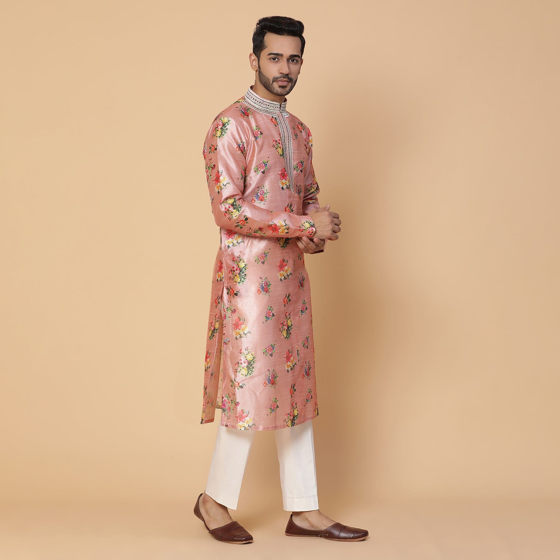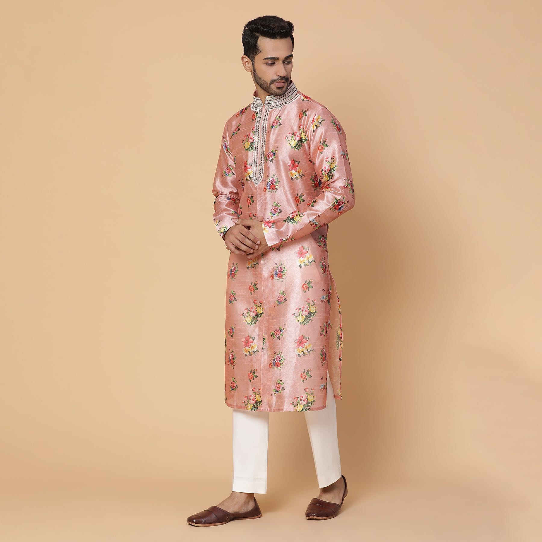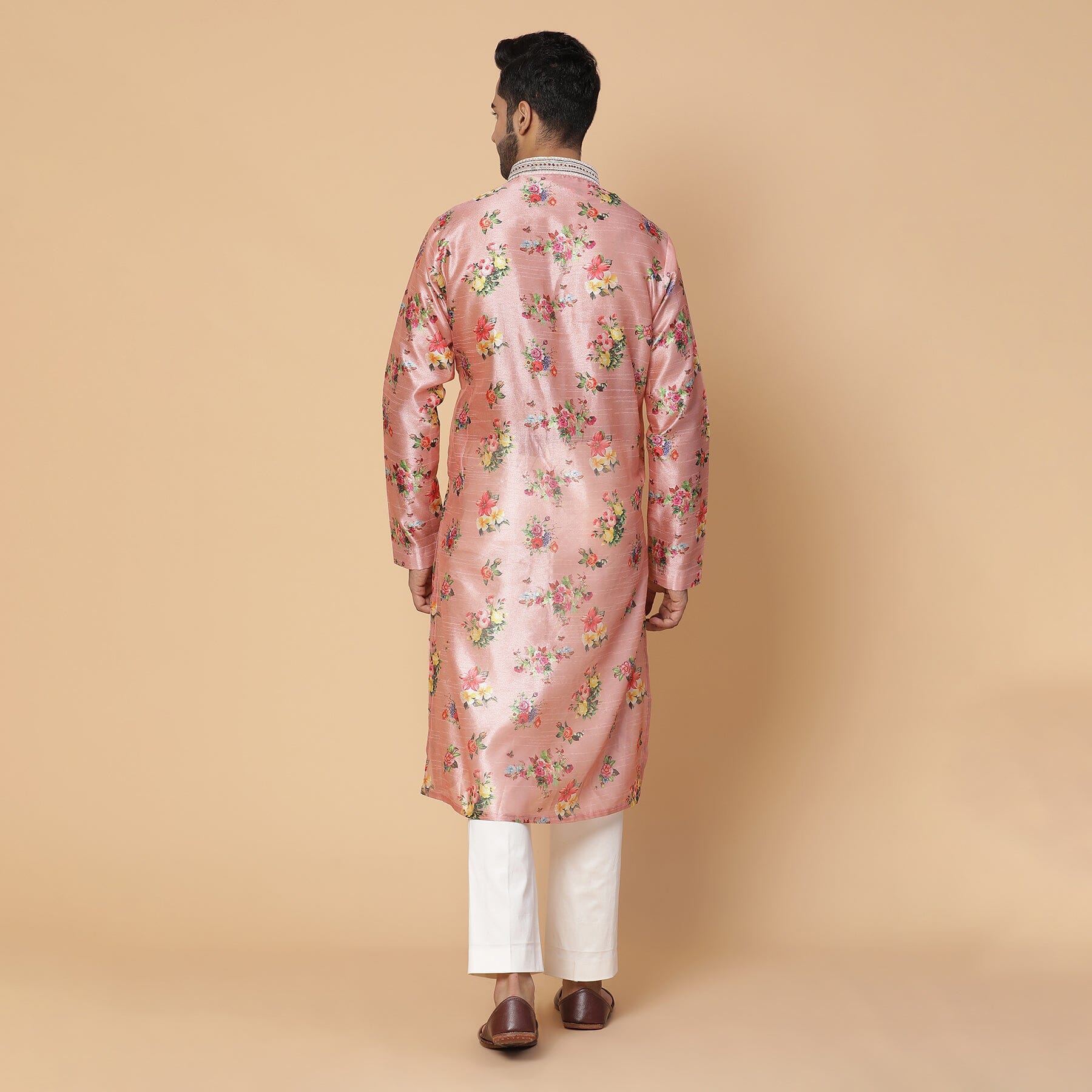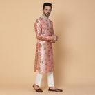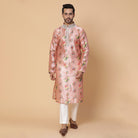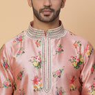 Una kurta floral de seda rosa con trabajo de anclaje en el cuello. Ajuste perfecto para padrinos de boda o invitados a la boda.