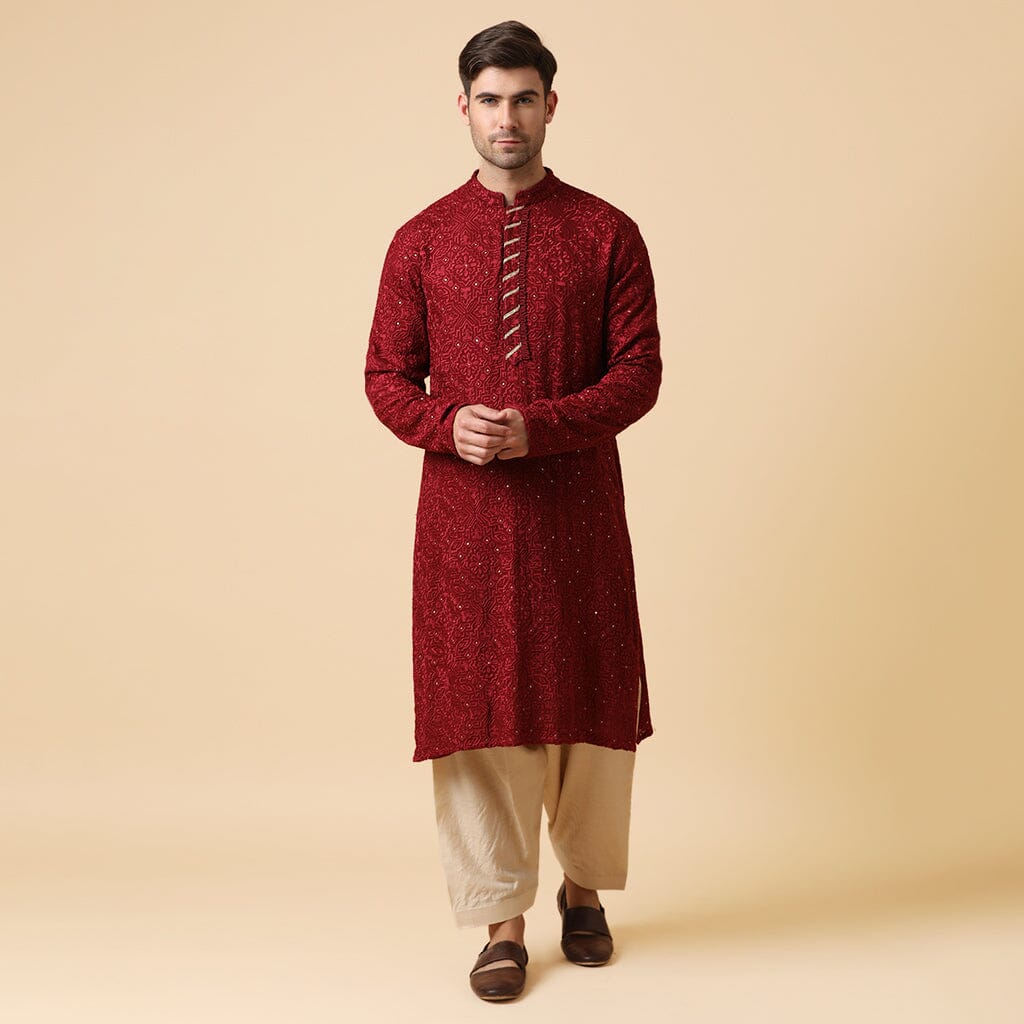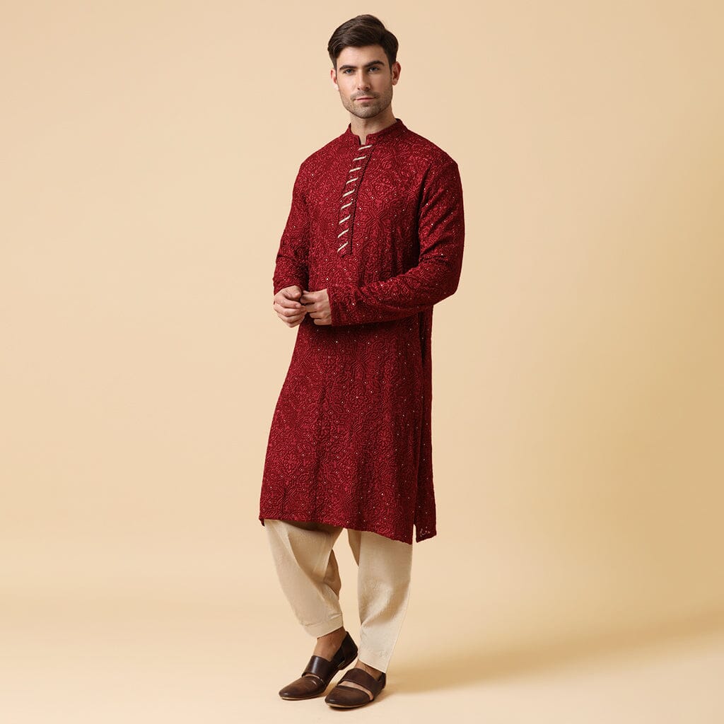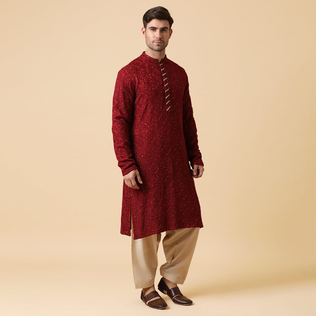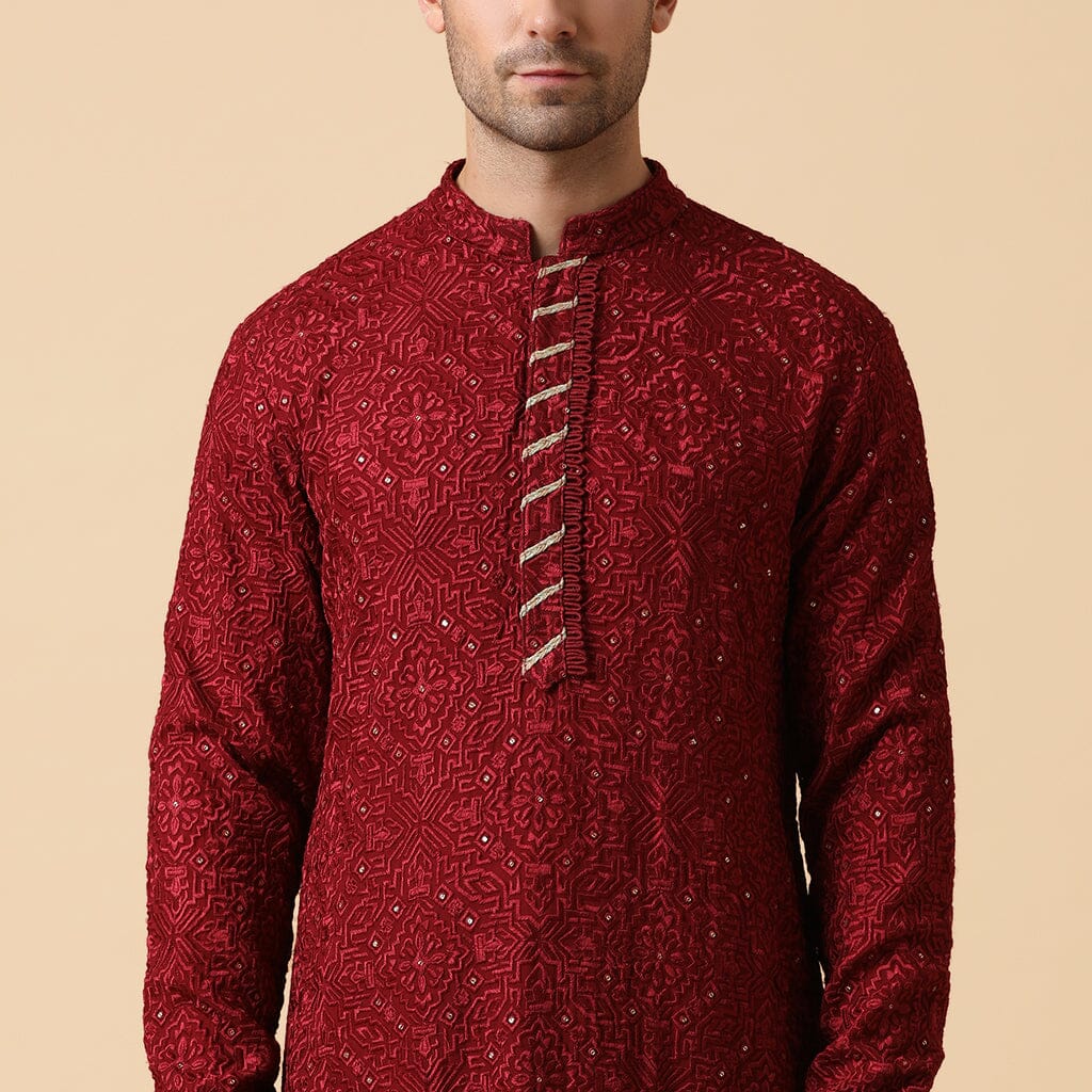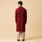 Un conjunto de kurta de hilo granate intenso con detalles de yute en la tapeta y salwar de seda. Perfecto para tu sangeet o mayun. Apropiado como invitado a una boda para una ceremonia de boda de día o de noche.