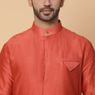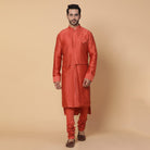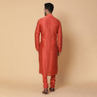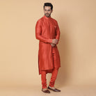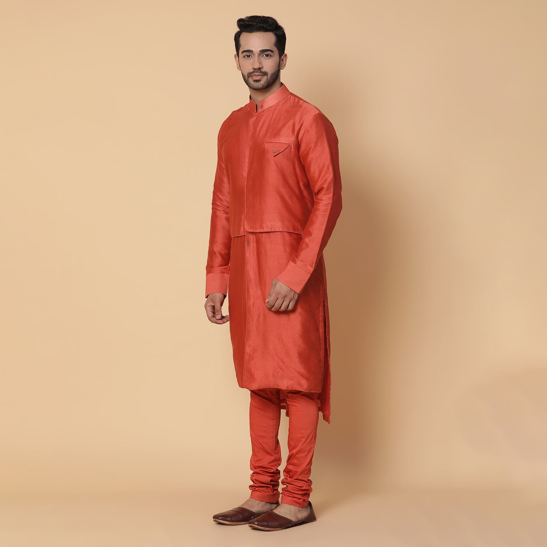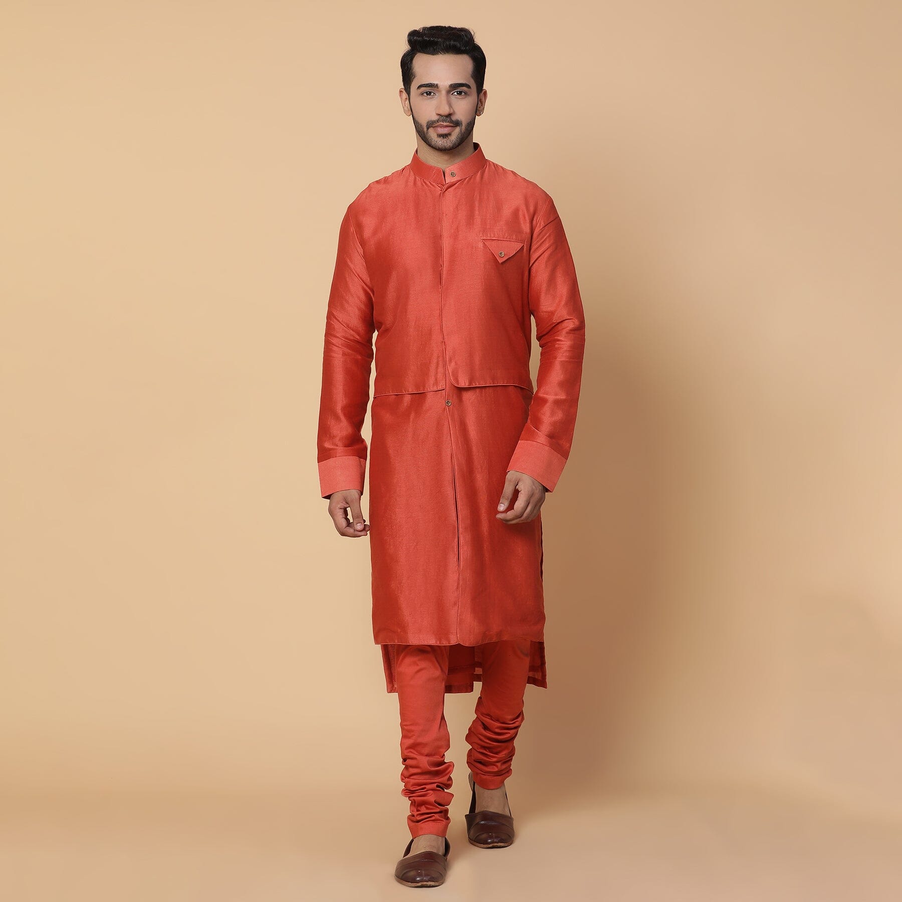 Chanderi Kurta de seda con solapa superpuesta y dobladillo asimétrico. Viene con churidar a juego. Ajuste perfecto para padrinos de boda o invitados a la boda.