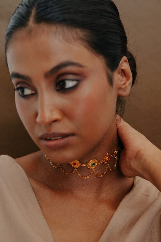 Handmade stud choker with intricate detailing and Emerald and Ruby stones
