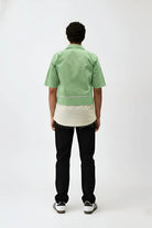 This asparagus green and ivory shirt has a clean, tailored design with a patch detail on the back. The front has pintucks on both sides of a zip opening, giving it a neat look. It comes with a classic collar for a simple finish. Easy to style for work or casual wear, this shirt is practical and versatile.
