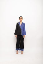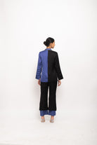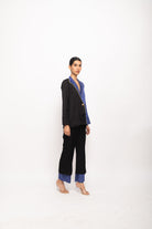 Conjunto de blazer negro-azul con blazer de mangas amplias con ribetes de neón en todo el borde y pantalones regulares con bloques de color negro-azul. Ropa de fiesta, informal, de oficina, de día, de vacaciones.