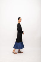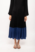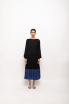 Vestido largo negro-azul con mangas amplias y fruncidos azules al final. Ropa de fiesta, informal, de oficina, de día, de vacaciones.