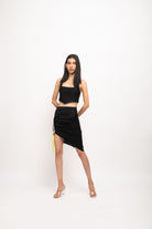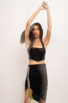 Bustier negro con ribete gris en todas partes y falda negra con fruncido gris en un lado. Ropa de fiesta, informal, de oficina, de día, de vacaciones.