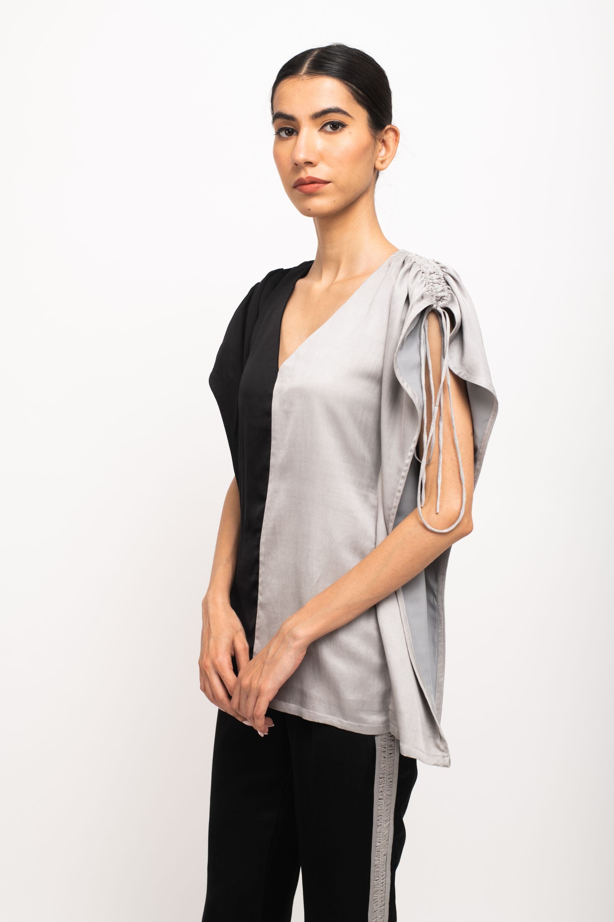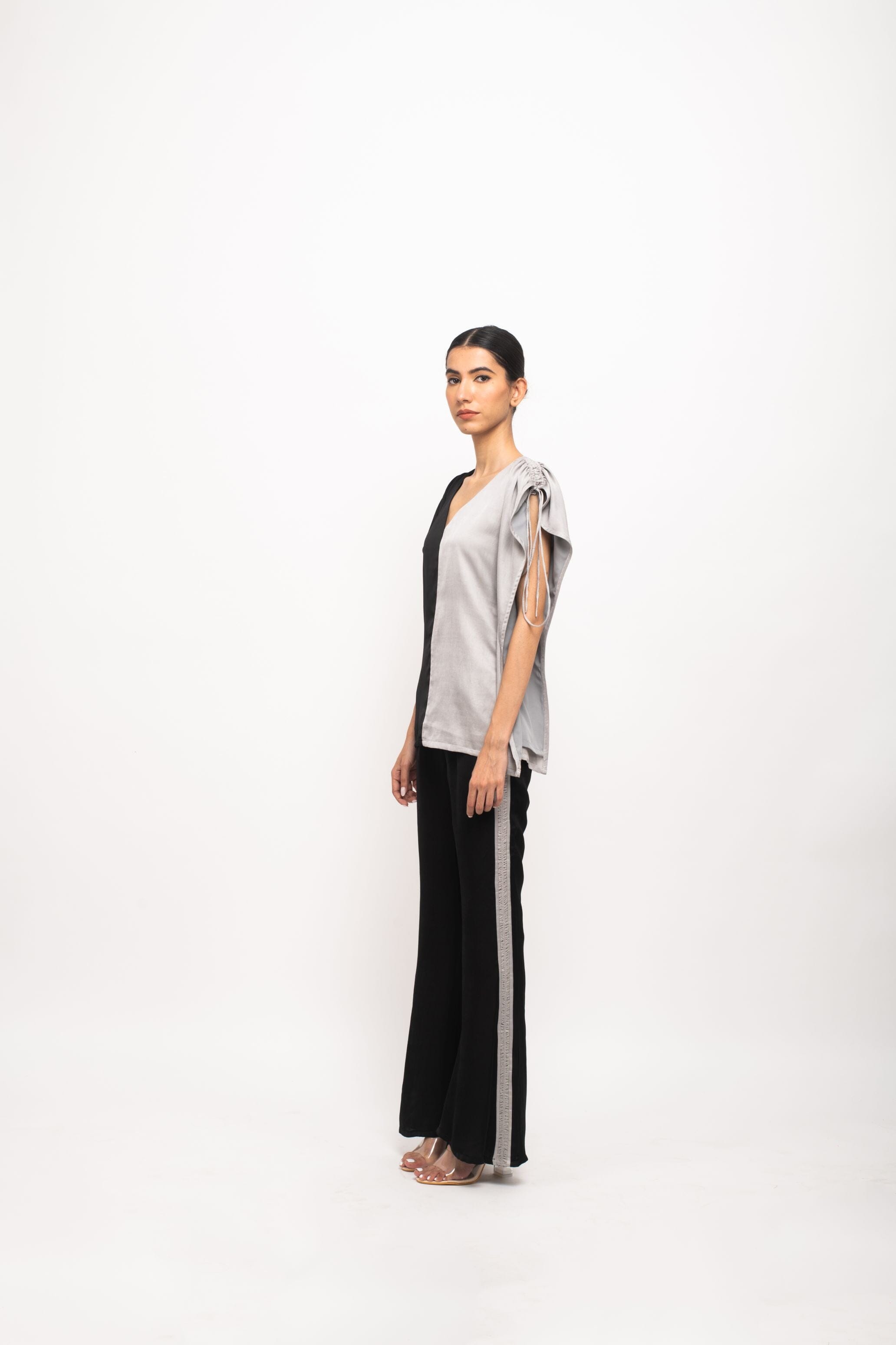 Top medio y medio caftán negro-gris con fruncidos en las mangas y pantalones acampanados negros con fruncidos en ambos lados. Ropa de fiesta, informal, de oficina, de día, de vacaciones