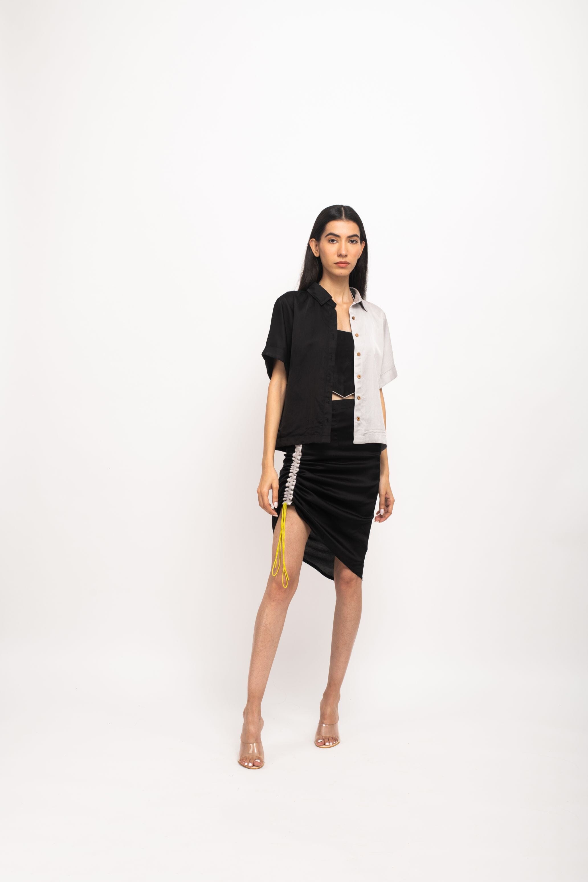 Conjunto de falda de tres piezas en negro y gris con camisa mitad y mitad corta, corpiño negro con ribete gris en todas partes y falda negra con fruncido gris en un lado. Ropa de fiesta, informal, de oficina, de día, de vacaciones.