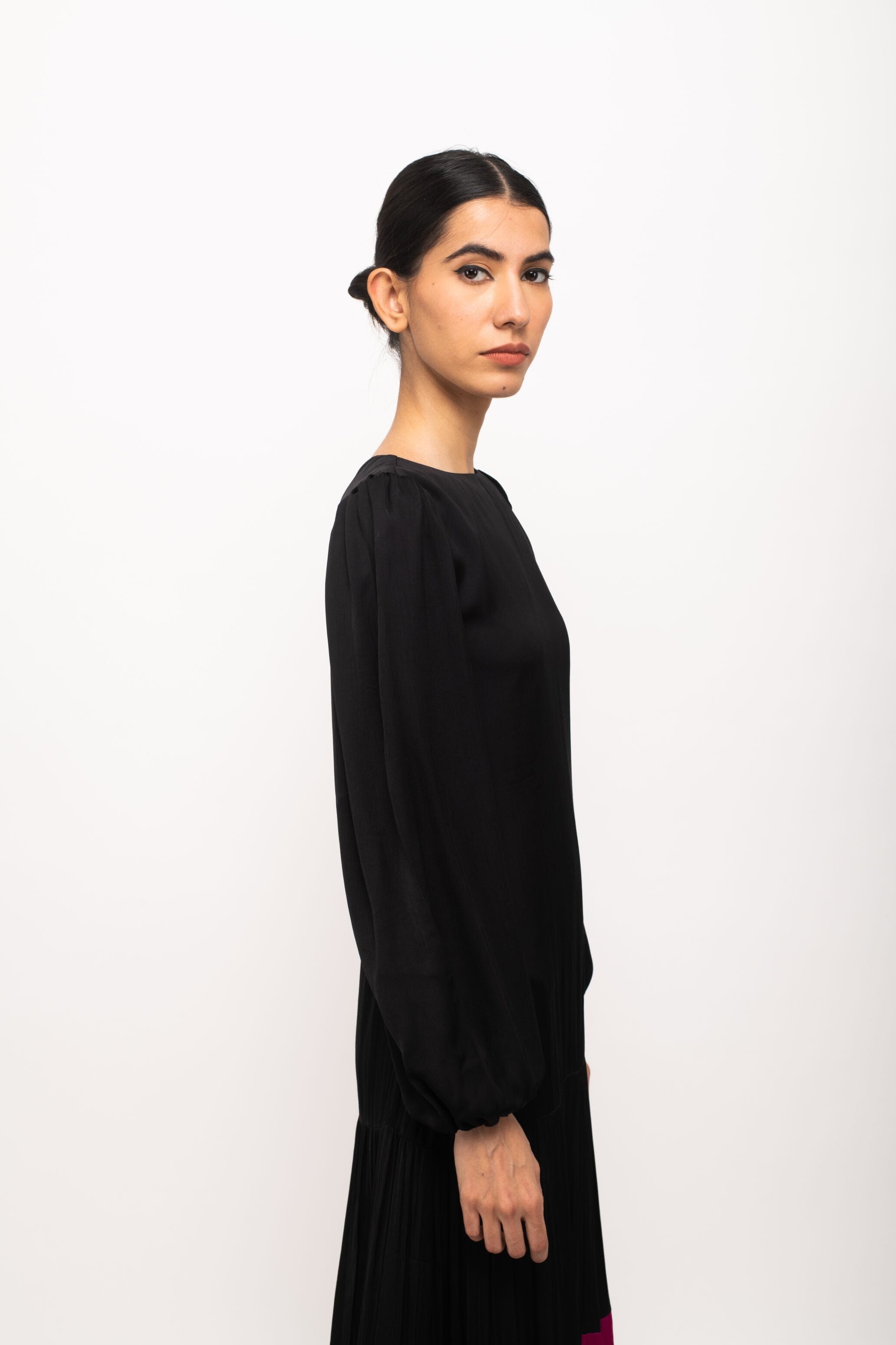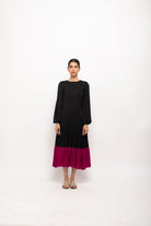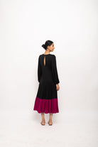 Vestido largo negro-vino con mangas amplias y fruncido color vino al final. Ropa de fiesta, informal, de oficina, de día, de vacaciones.
