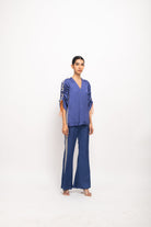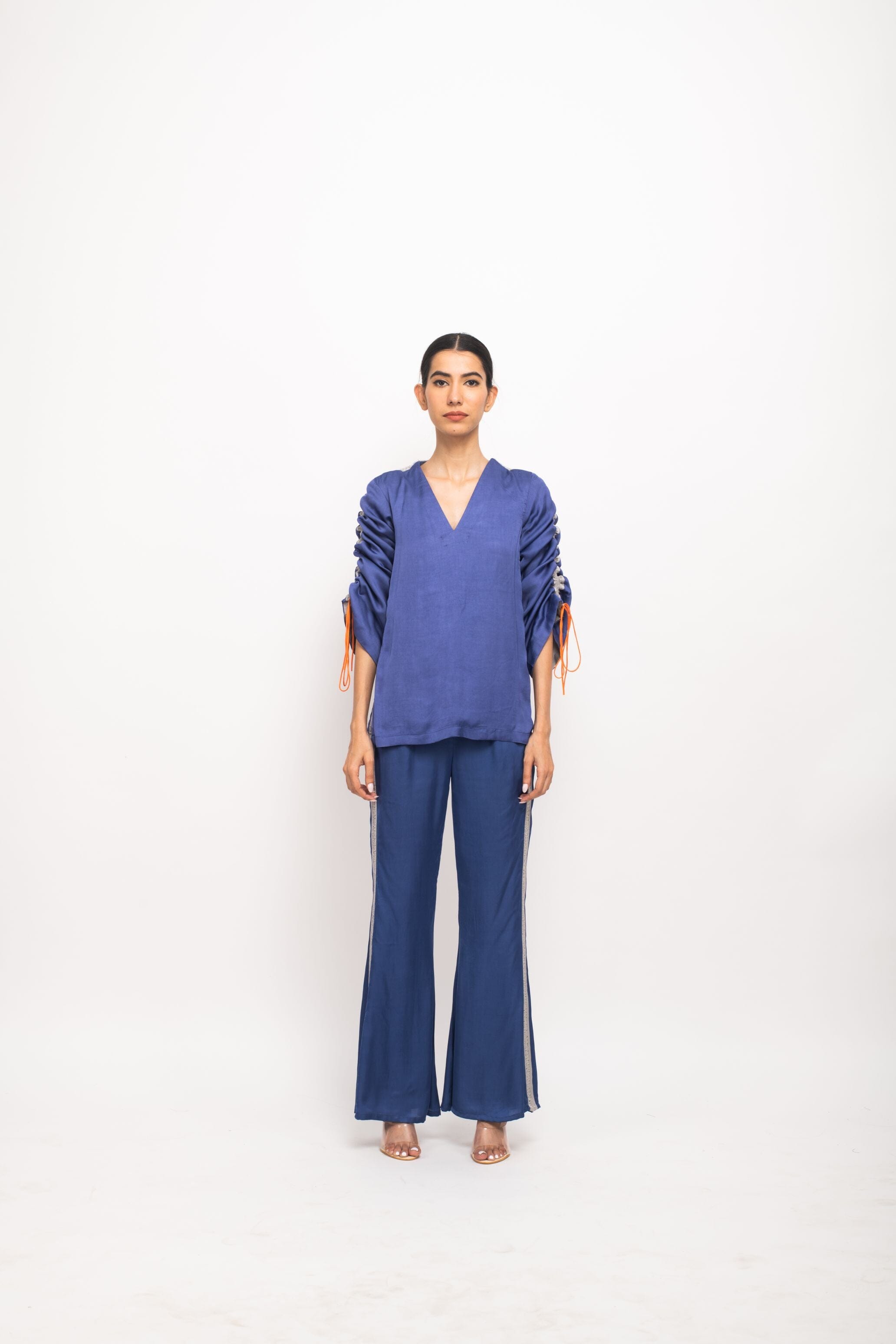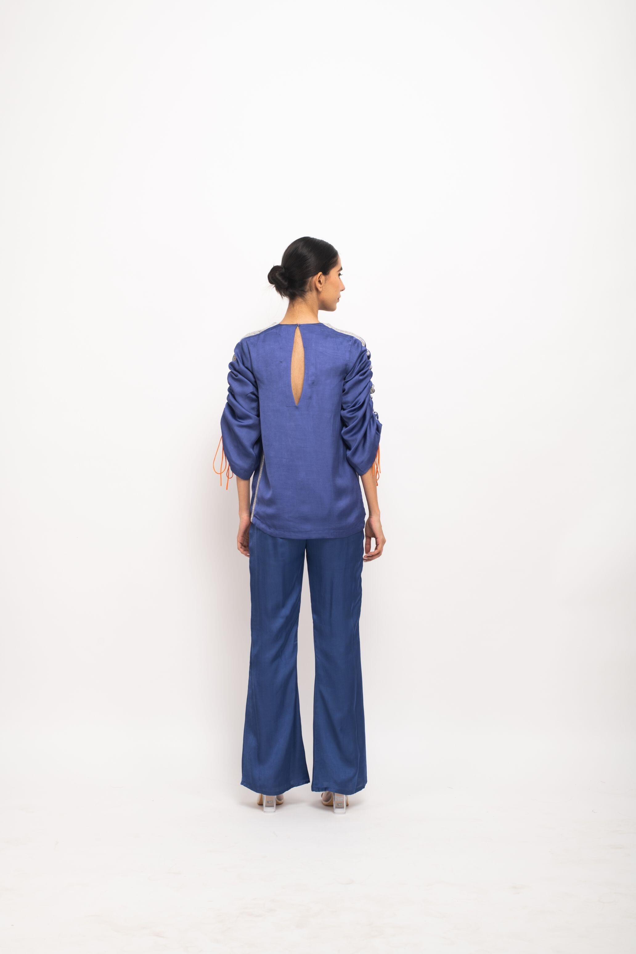 Top de manga larga azul grisáceo con fruncidos en las mangas, lo que hace que su longitud sea ajustable y pantalones azules rectos con fruncidos grises en ambos lados. Ropa de fiesta, informal, de oficina, de día, de vacaciones.