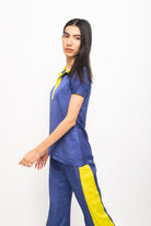 Top azul neón de ajuste regular con pantalones azules acampanados con paneles de neón en ambos lados. Ropa de fiesta, informal, de oficina, de día, de vacaciones.