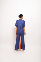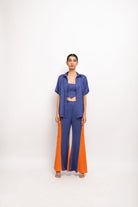 Conjunto de tres piezas en azul y naranja; Bustier azul con cuello halter combinado con una camisa con paneles azul-naranja y pantalones acampanados con paneles azul-naranja. Ropa de fiesta, informal, de oficina, de día, de vacaciones