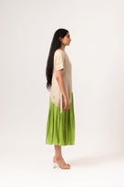 Vestido midi fruncido asimétrico color crudo-verde con media manga. Seda Sostenible.