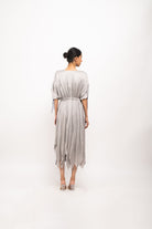 Vestido asimétrico angrakha gris azulado con fruncidos en la cintura y los hombros y panel azul en el costado. Ropa de fiesta, informal, de oficina, de día, de vacaciones