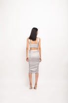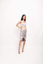 Bustier gris con ribete azul en todas partes y falda gris con pliegues en la parte delantera. Ropa de fiesta, informal, de oficina, de día, de vacaciones.