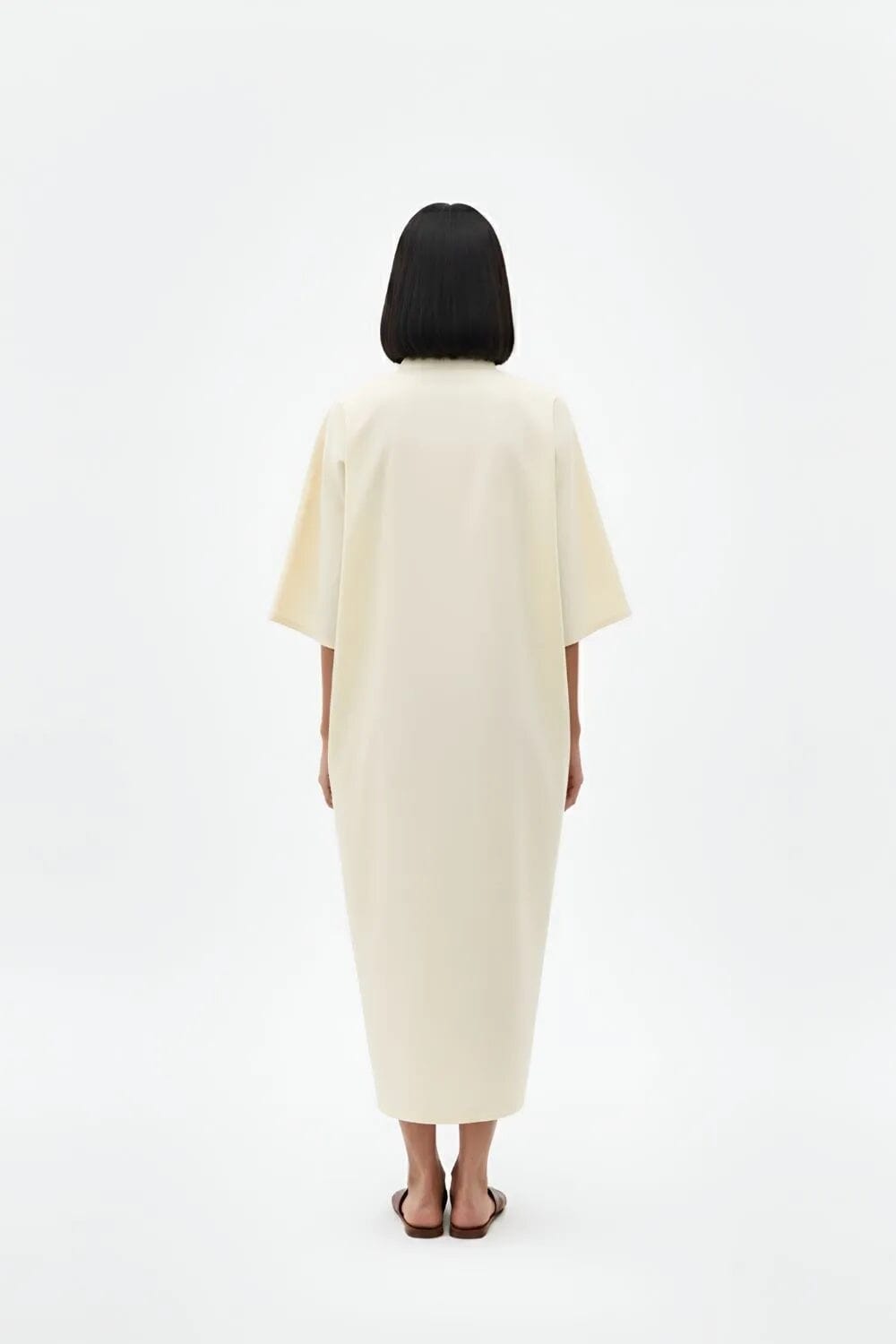 This ivory-mango yellow dress, which is made of twill, radiates effortless elegance. The full-length shape allows for a variety of style options, and the colorblock pin tucks and trumpet quarter sleeves add drama. It is ideal for stylish comfort and creates a striking impression at any event. Ideal for a smooth transition between day and night