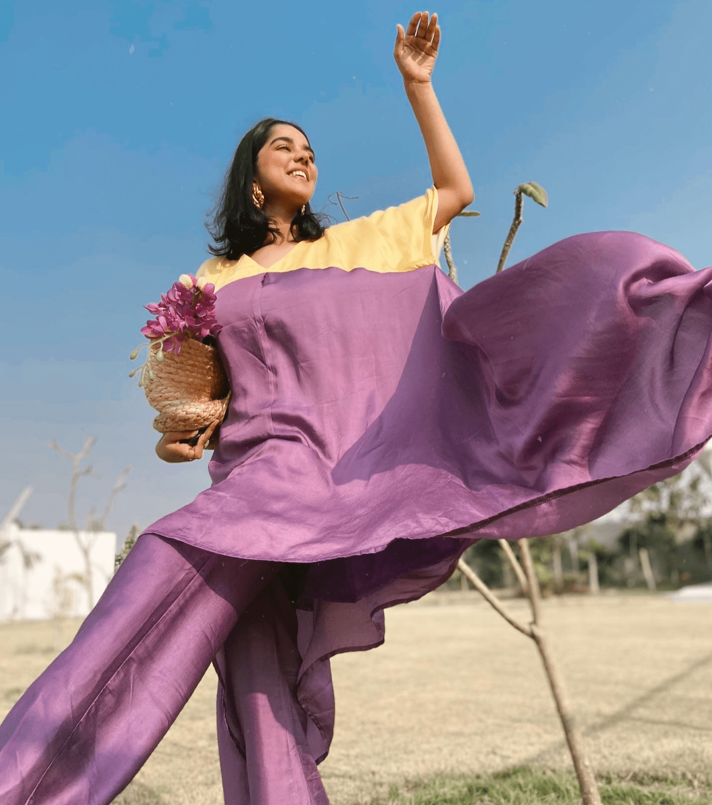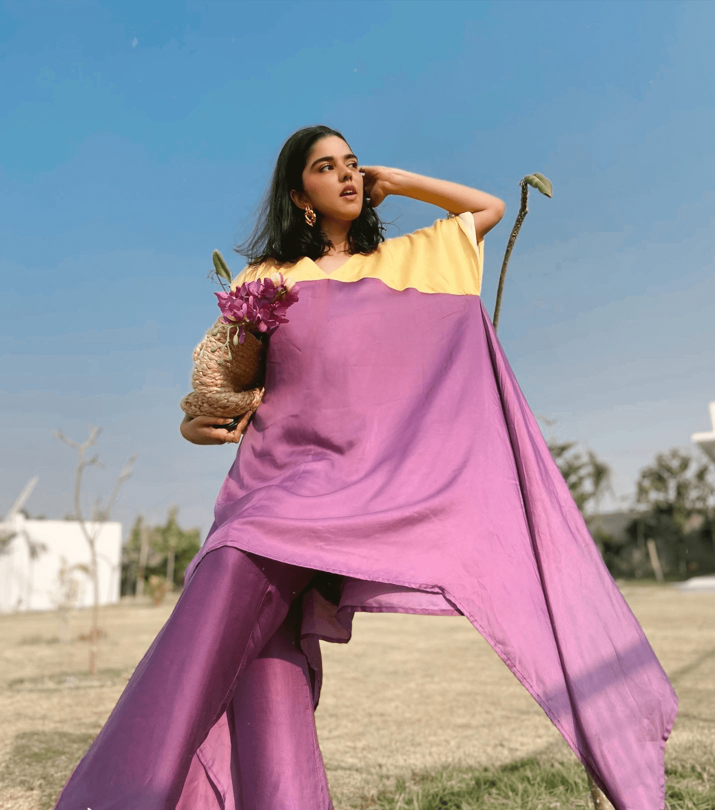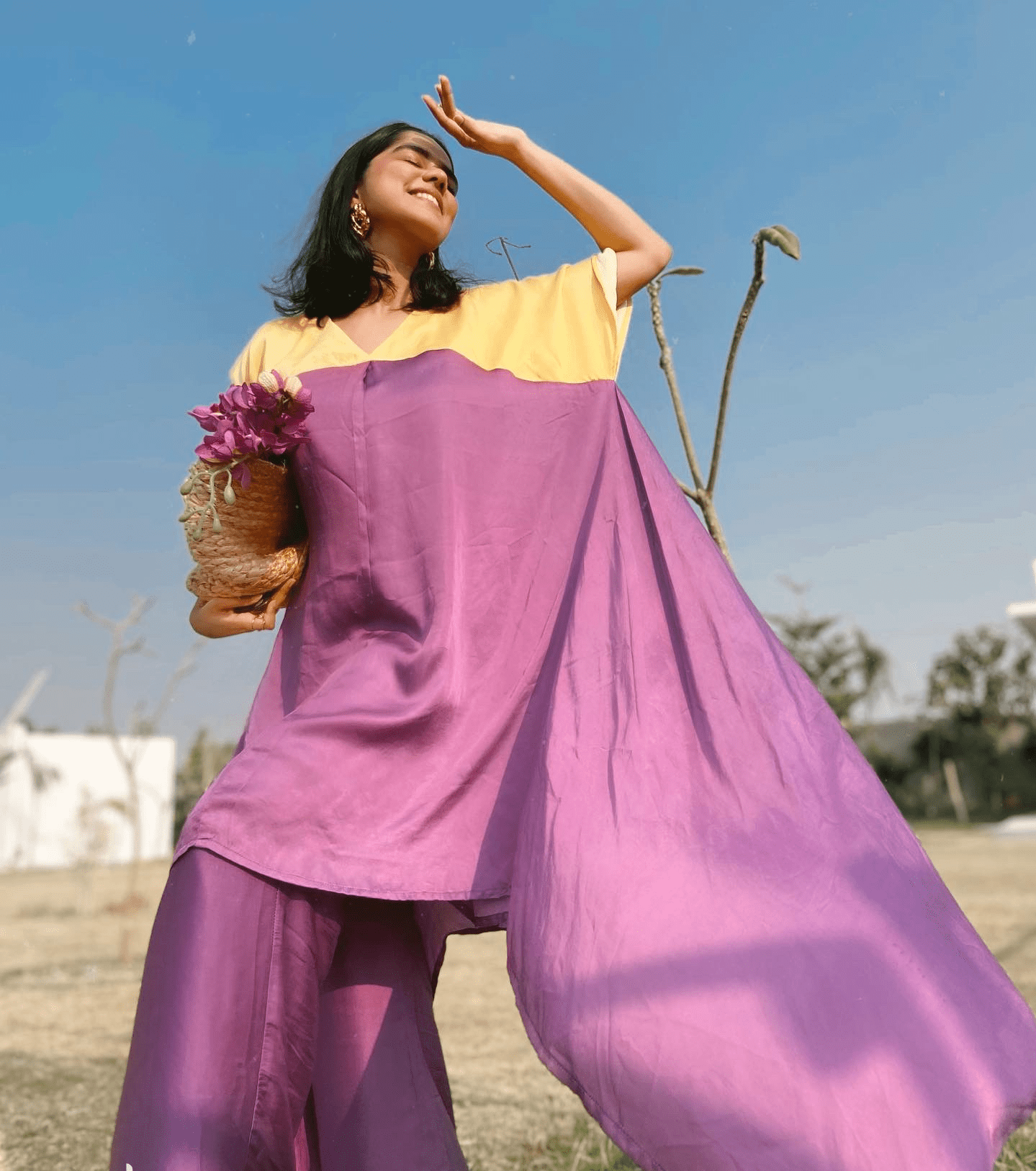 Túnica asimétrica con bloques de color morado y amarillo y pantalones morados de piernas anchas. Seda de verano.