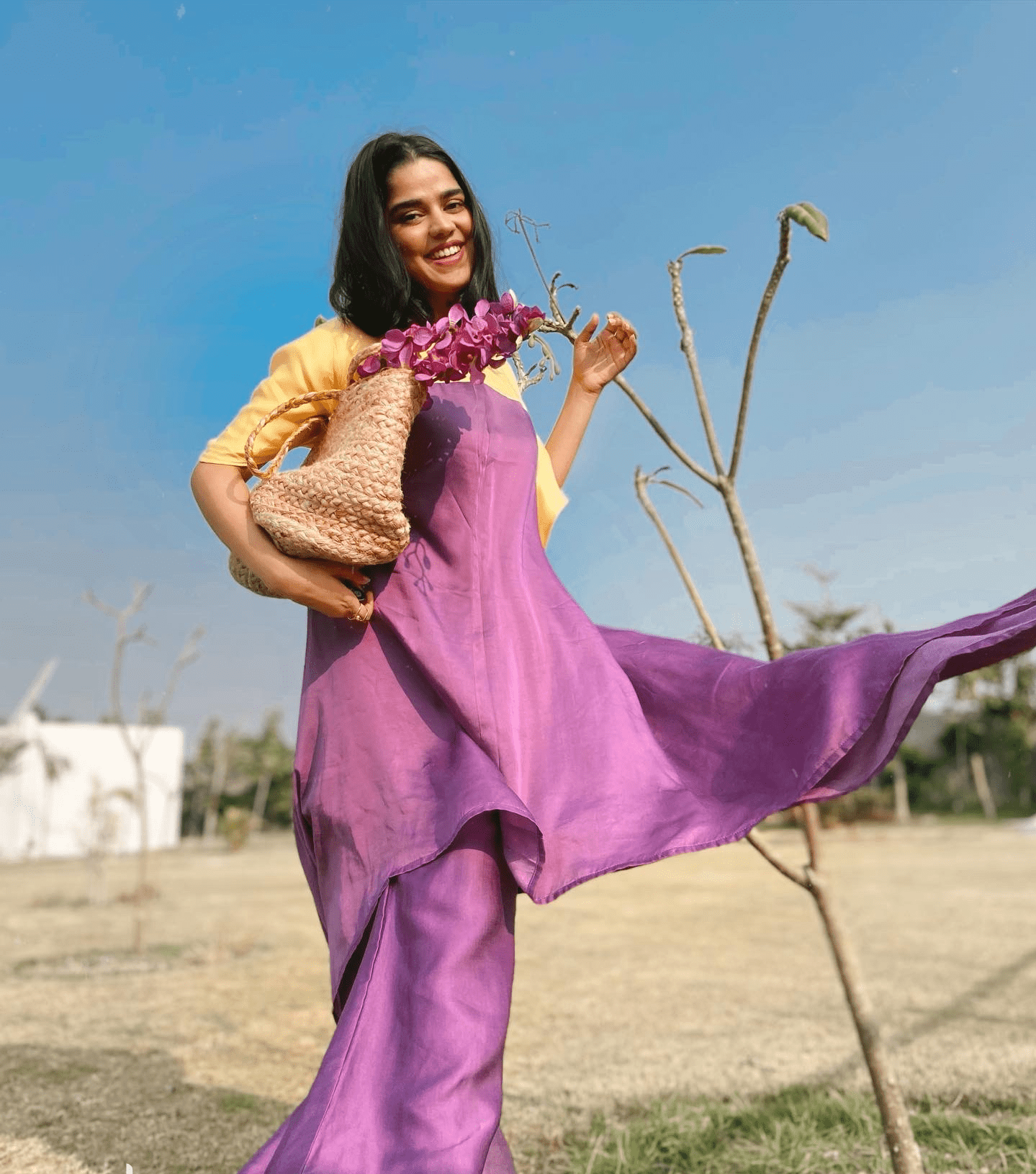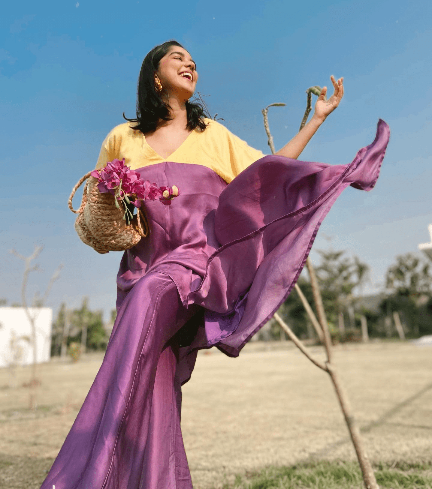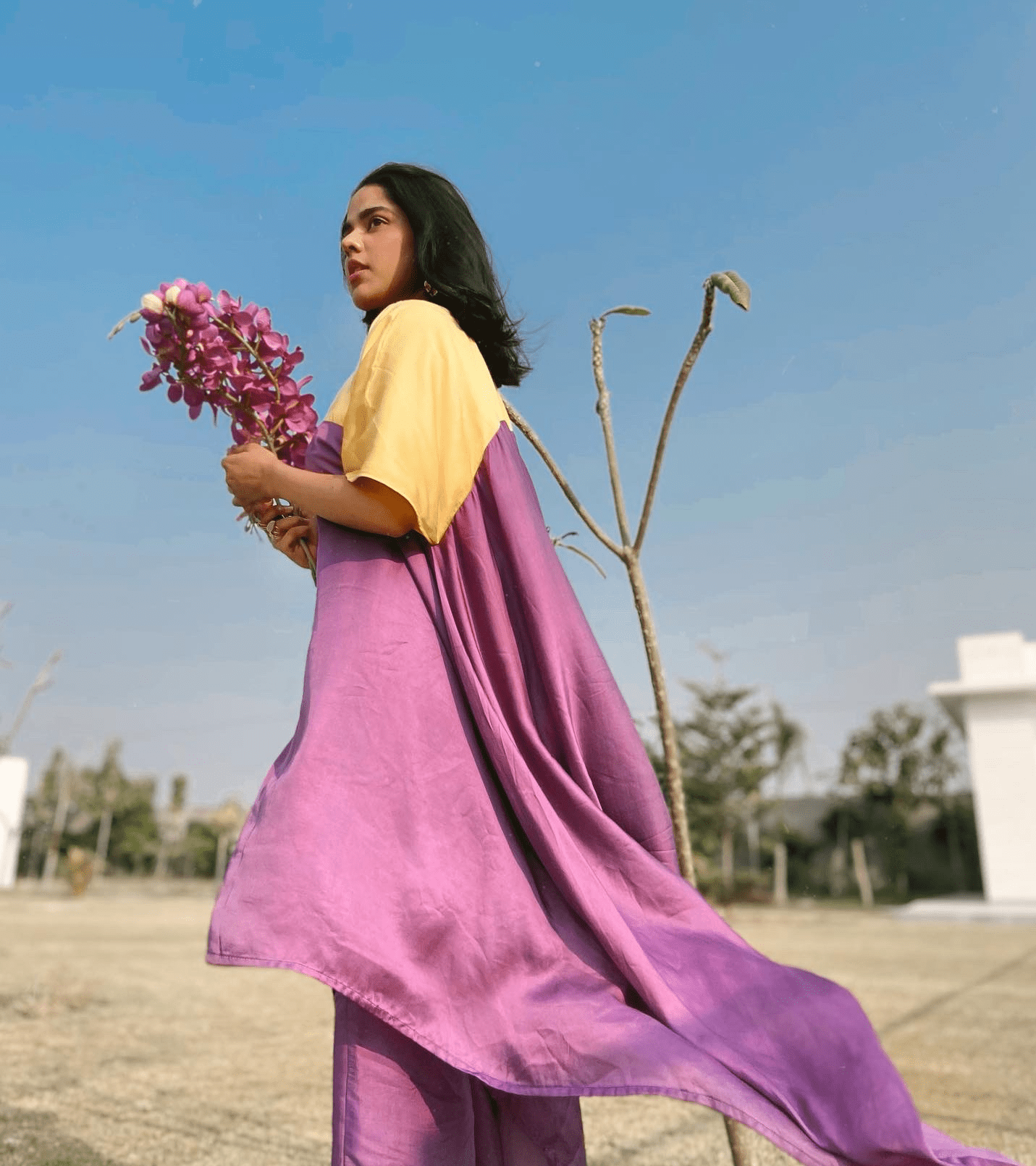Túnica asimétrica con bloques de color morado y amarillo y pantalones morados de piernas anchas. Seda de verano.