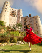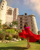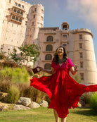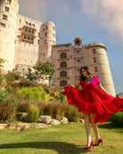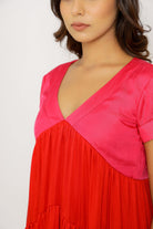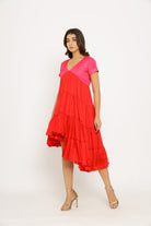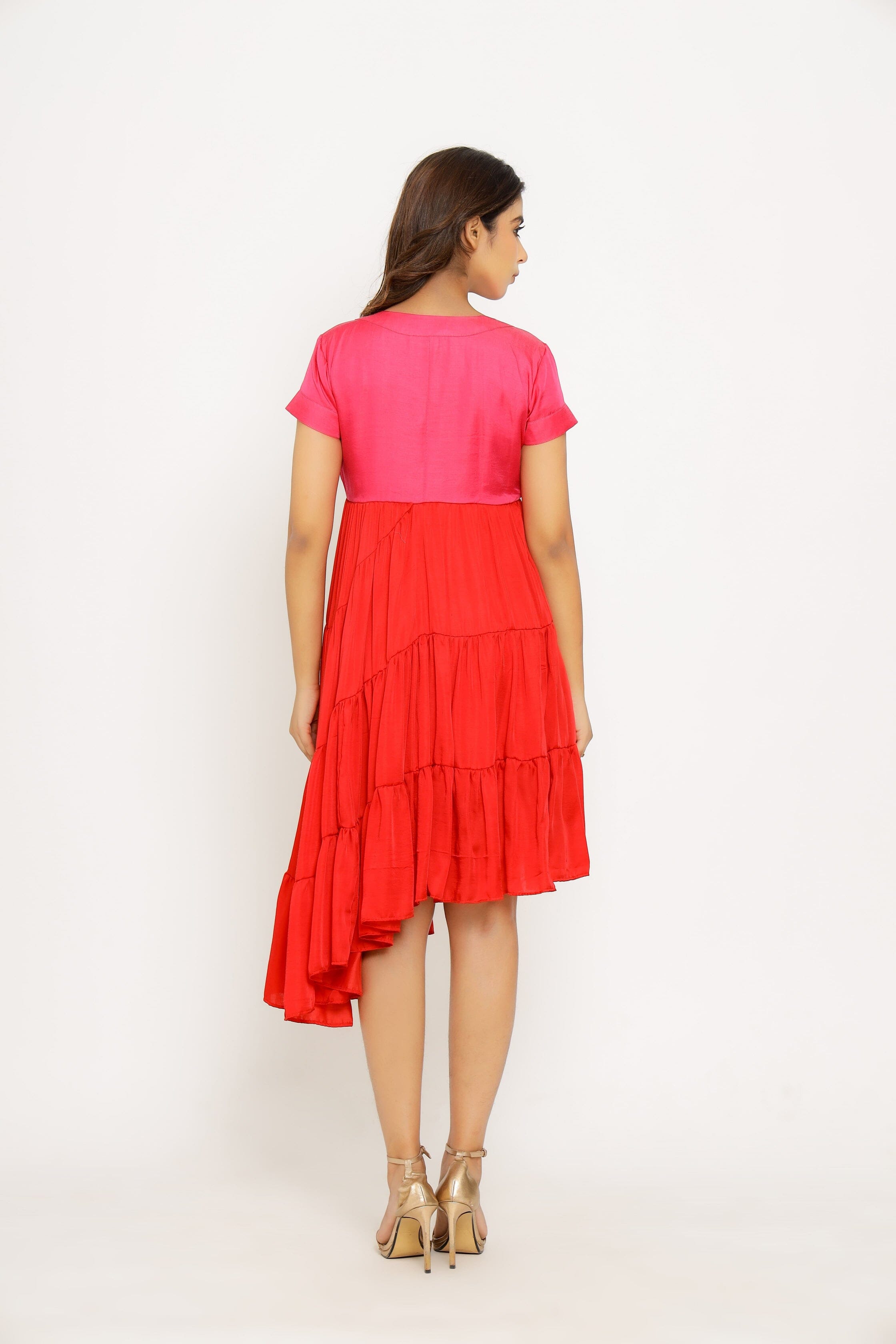 Vestido de largo medio rojo y rosa con frunces y patrón asimétrico alto-bajo.