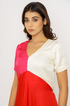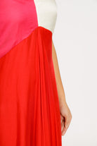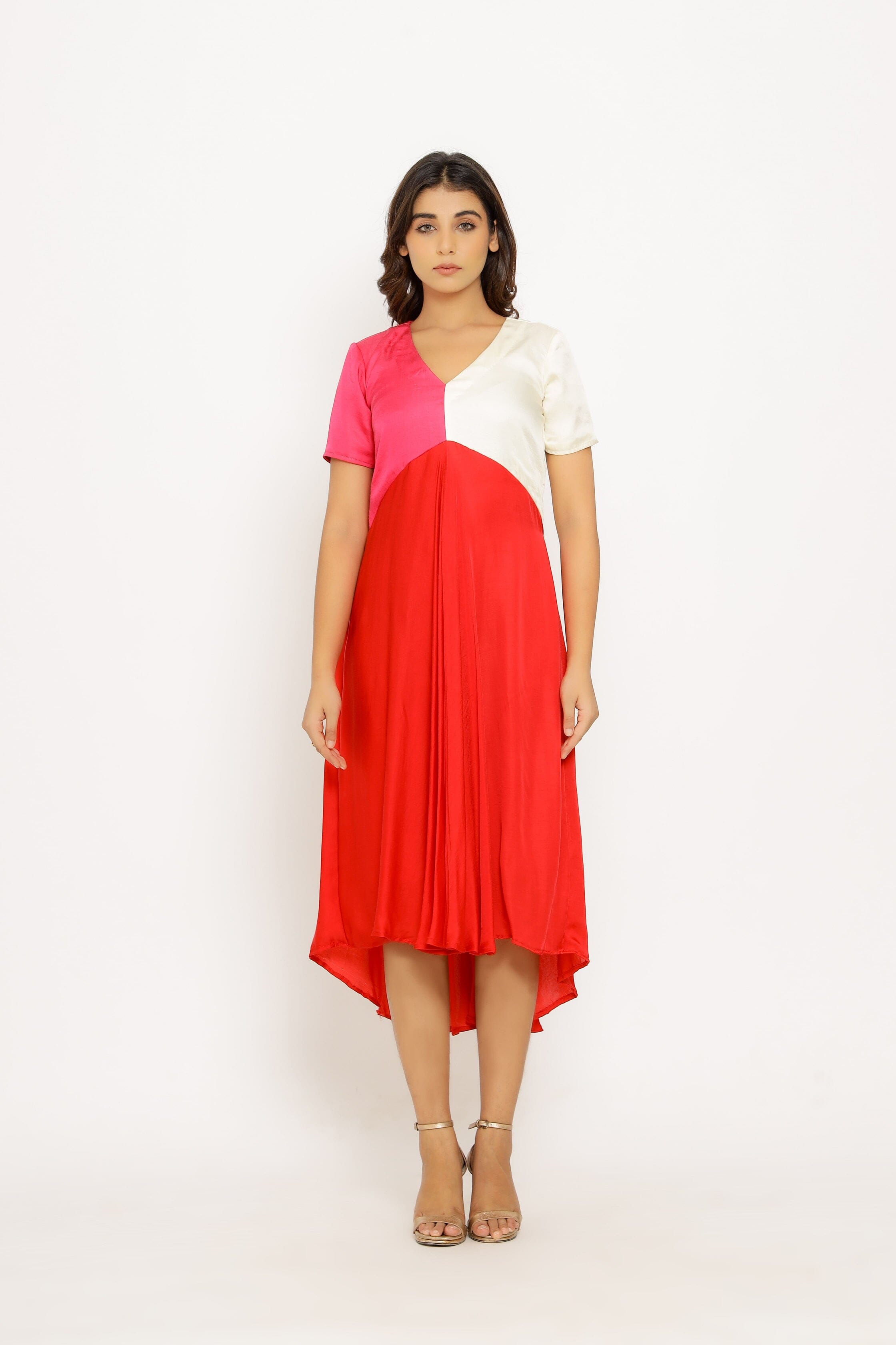 Vestido midi rojo-rosa con patrón tricolor. Seda Sostenible.