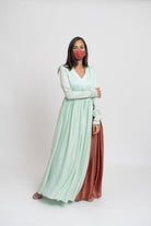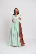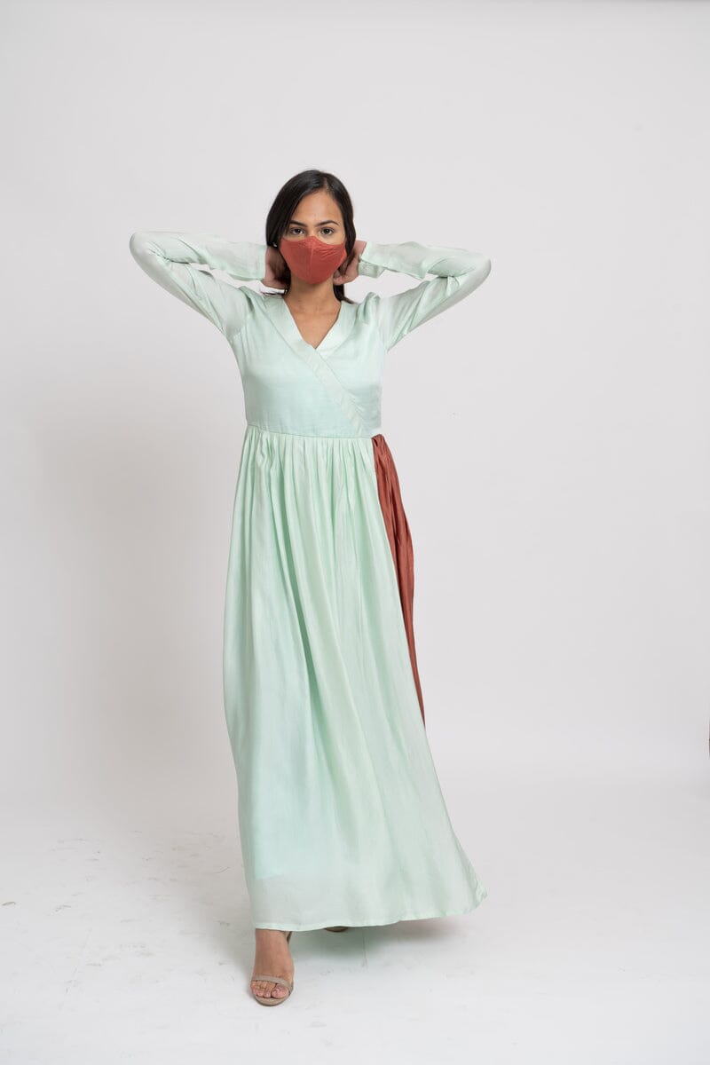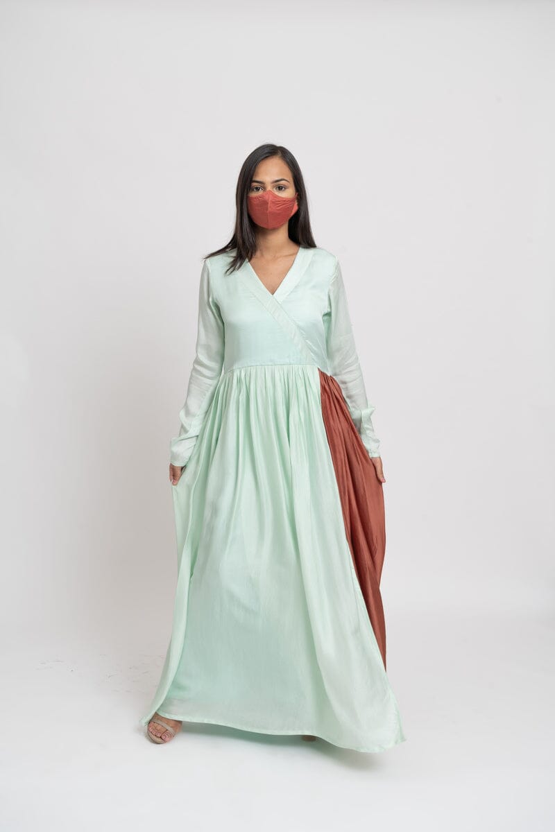 Angrakha verde té y marrón caramelo. Seda de verano.