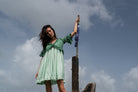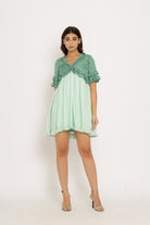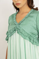 Minivestido verde azulado con frunces y volantes en cuello, mangas y bajo. Seda Sostenible.