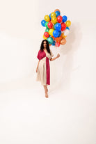 Vestido midi de paneles cuadrados color crudo-vino, de media manga y entallado en cintura. Seda Sostenible.