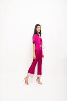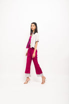 Conjunto de tres piezas en gris vino con camisa mitad y mitad corta, corpiño color vino con ribete gris en todas partes y pantalones regulares con bloques de color gris vino. Ropa de fiesta, informal, de oficina, de día, de vacaciones
