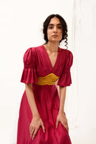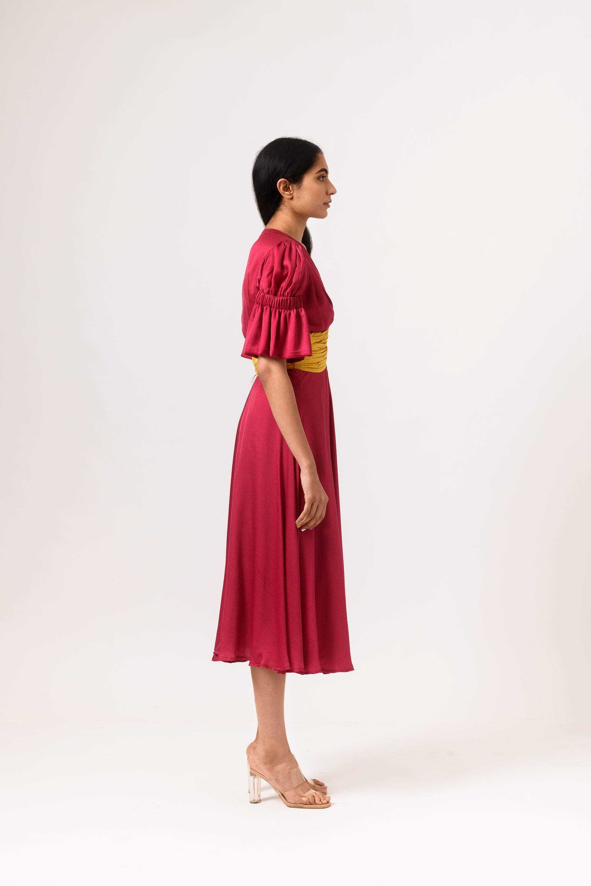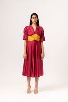 Vestido fruncido de color amarillo vino con fruncido amarillo alrededor de la cintura y manga con estampado de codos. Seda Sostenible.