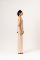 Conjunto de cuello halter en amarillo-crudo con pantalones de pernera ancha. Seda Sostenible.