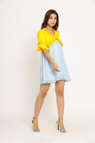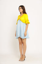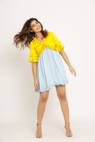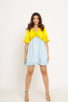 Minivestido amarillo-azul hielo con frunces y volantes en cuello, mangas y bajo.