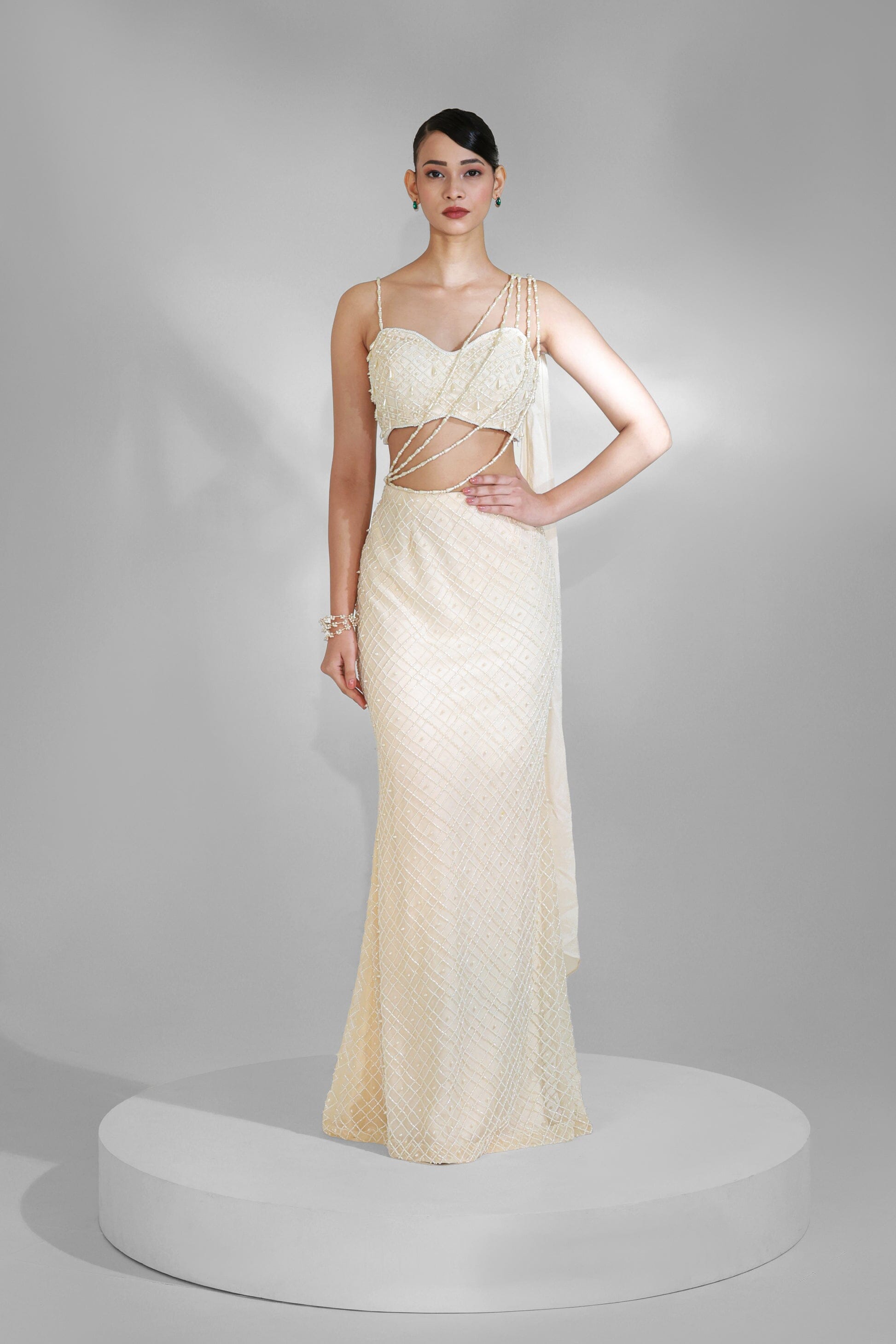 – Dupatta: Signature pearl-front drape, turning into fabric fall at the back