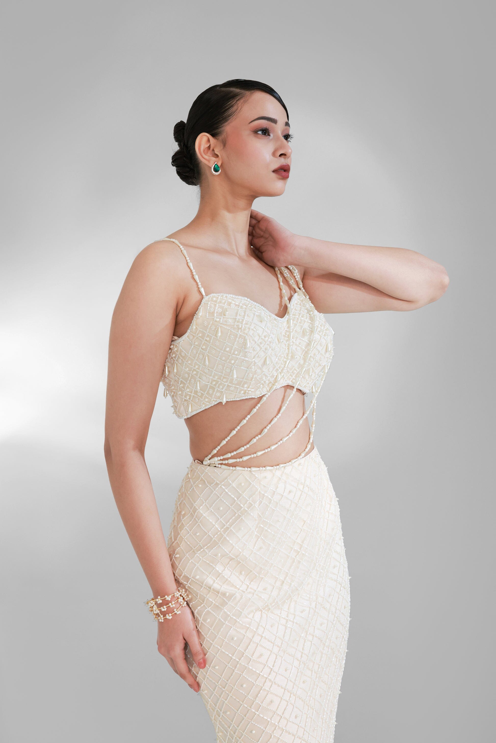– Skirt: Pearl-encrusted embroidery with flowing silhouette