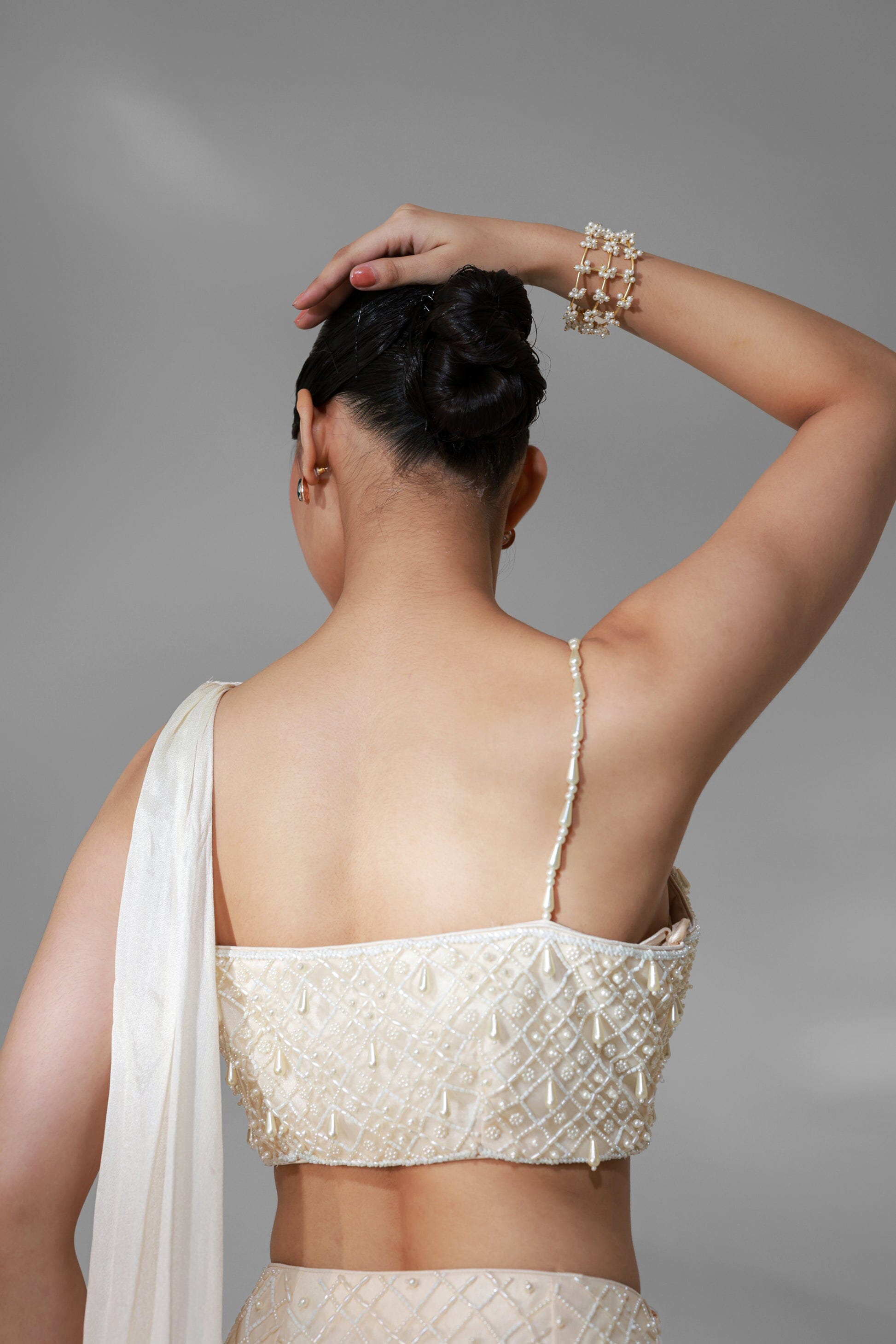 An ode to modern royalty, crafted entirely in pearls. This set features a blouse and skirt richly hand-embroidered with layers of pearls, delicate pearl tassels, and intricate detailing using varied pearl sizes for depth and dimension. The highlight is the dramatic dupatta — starting as a cascading pearl drape in the front and seamlessly transitioning into soft fabric at the back, creating a statement that is both bold and ethereal.