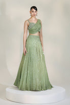 Commanding yet fluid, sage green ensemble is crafted for the modern muse. The hand-embroidered blouse, cinched to perfection, comes with an attached drape that adds effortless movement. Paired with a richly detailed lehenga skirt, every shimmer of threadwork and sequin reflects power, poise, and celebration.